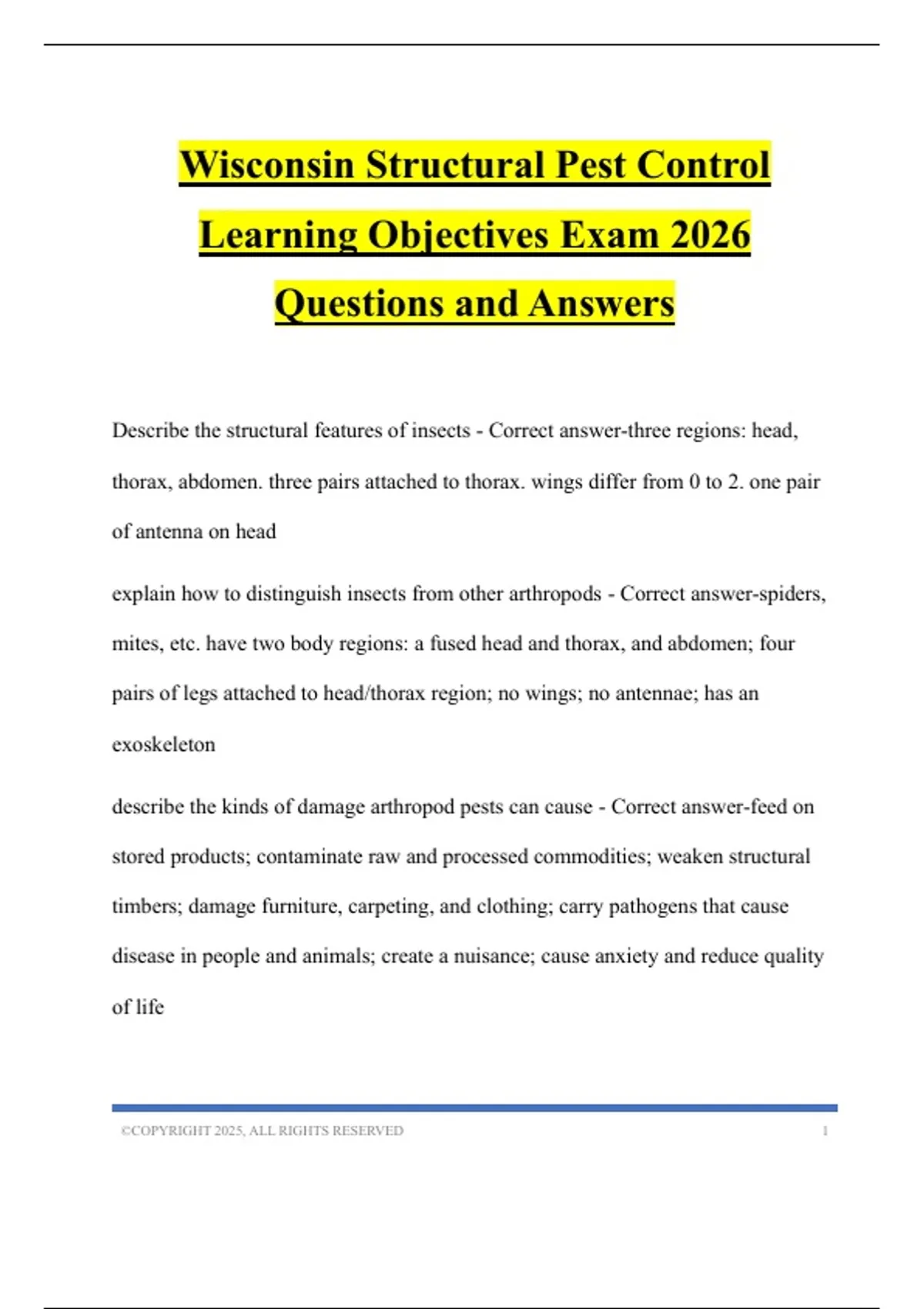 Wisconsin Structural Pest Control Learning Objectives Exam 2026 Questions and Answers