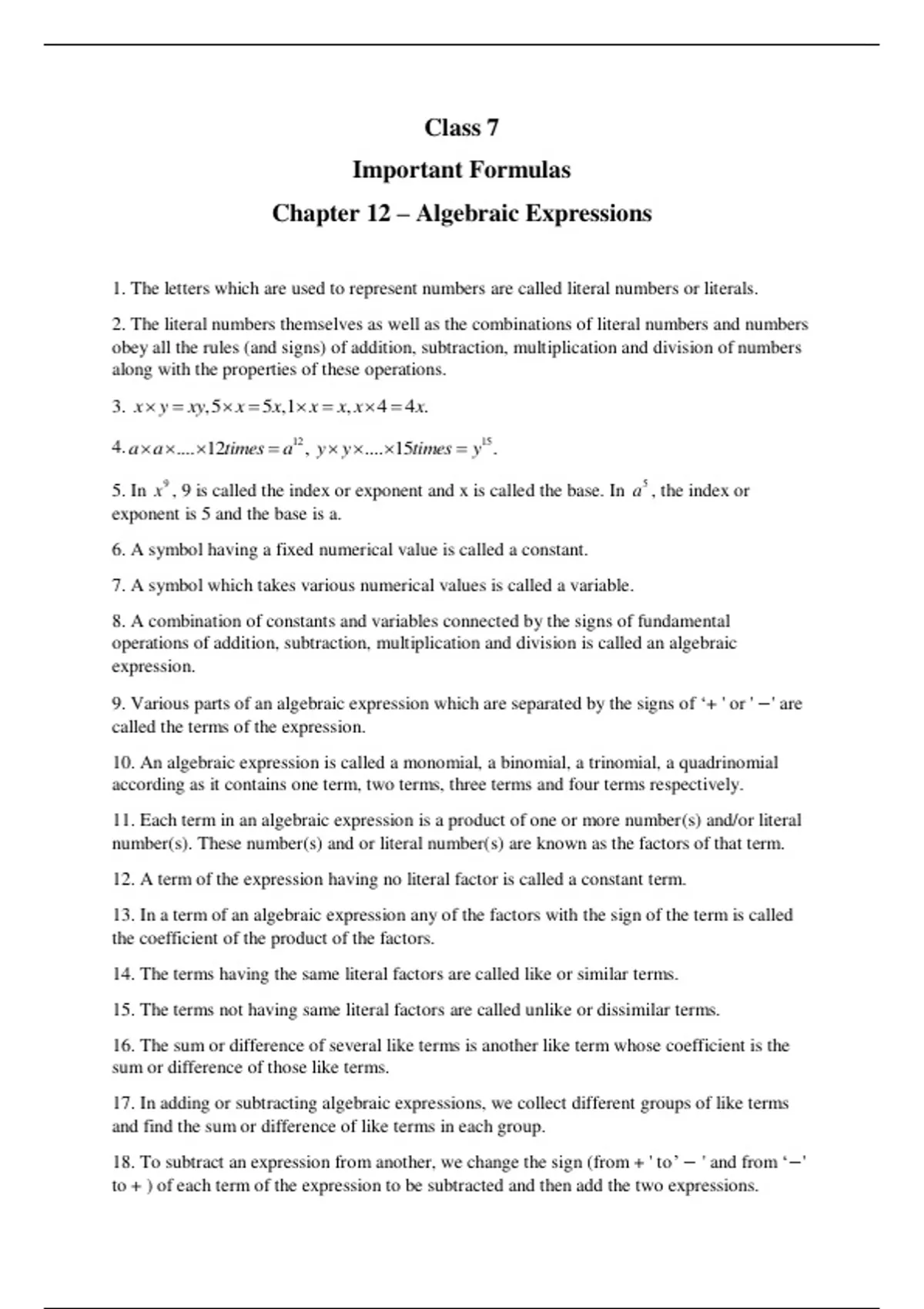 12. A term of the expression having no literal factor is called a constant term.