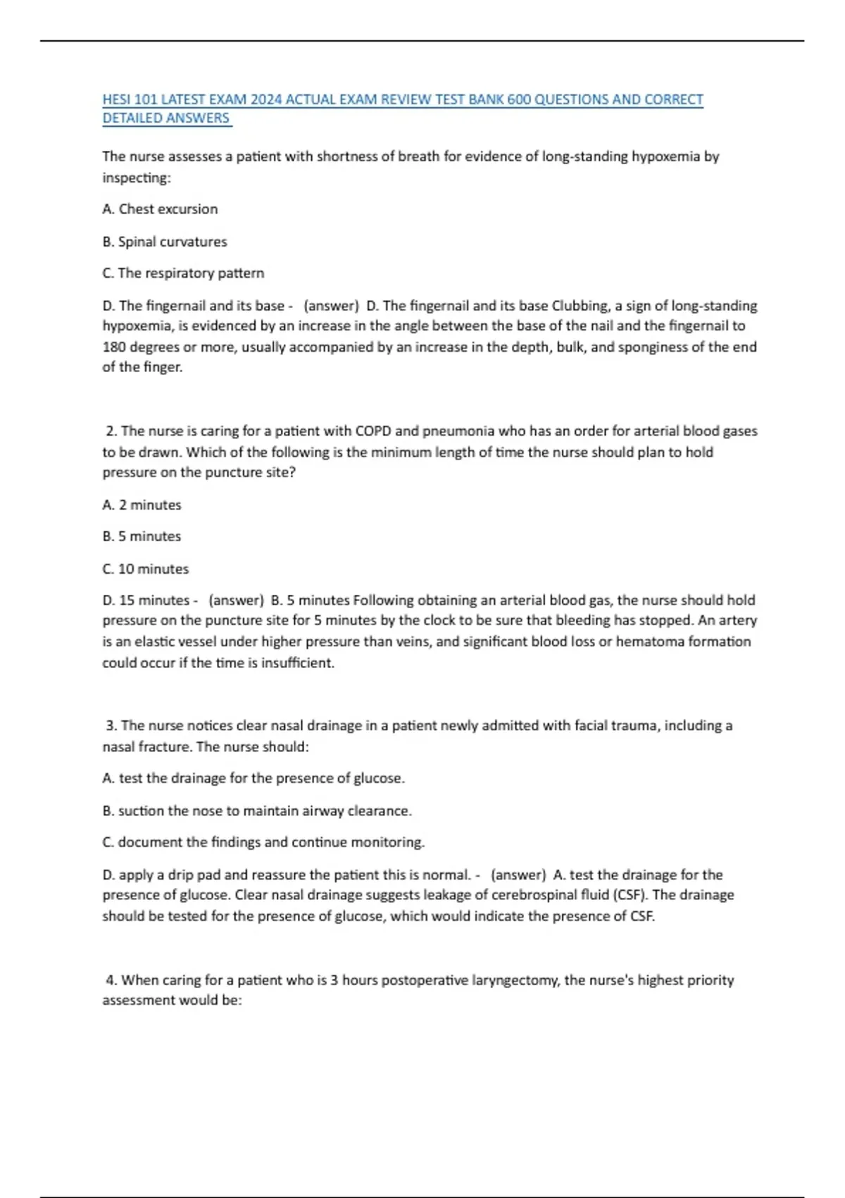 HESI 101 LATEST EXAM 2024 ACTUAL EXAM REVIEW TEST BANK 600 QUESTIONS AND CORRECT
