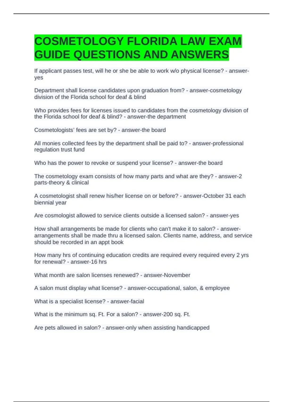 COSMETOLOGY FLORIDA LAW EXAM