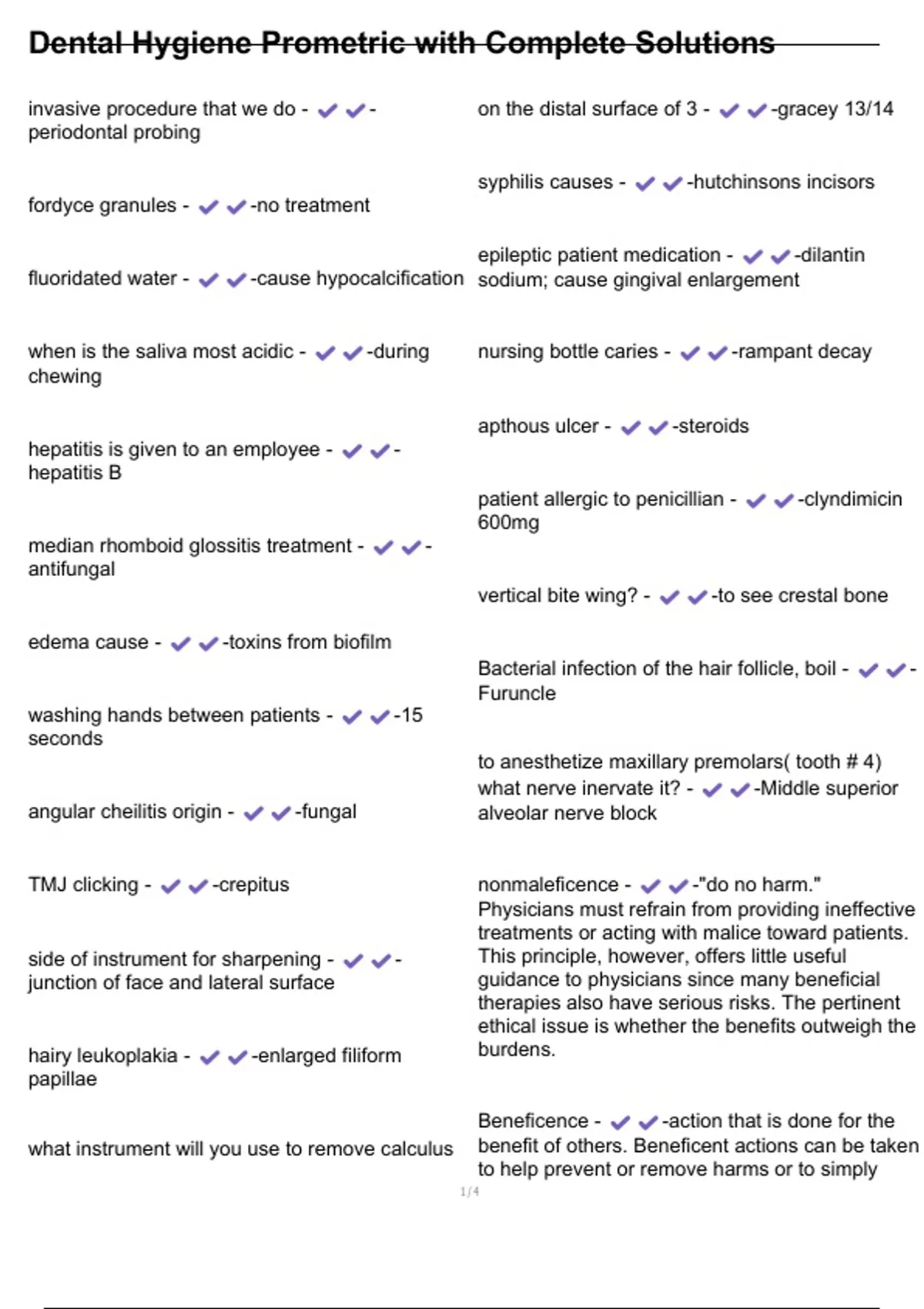 Dental Hygiene Prometric with Complete Solutions invasive procedure that we do - - periodontal probing fordyce granules - -no treatment fluoridated water - -cause hypocalcification when is th