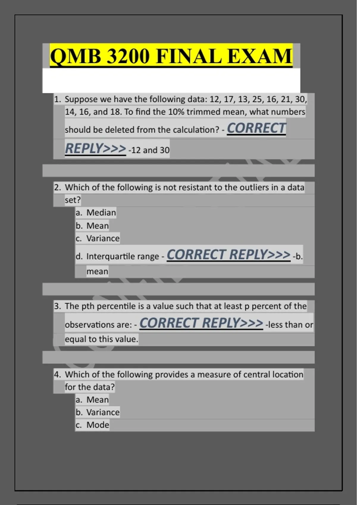 QMB 3200 FINAL EXAM 1. Suppose we have the following data: 12, 17, 13, 25, 16, 21, 30, 14, 16, and 18. To find the 10% trimmed mean, what numbers should be deleted from the calculation? - CORRECT REPLY>>> -12 and 30 2. Which of the following is not resistant to the outliers in a data set? a. Median b. Mean c. Variance mean d. Interquartile range - CORRECT REPLY>>> -b. 3. The pth percentile is a value such that at least p percent of the observations are: - CORRECT REPLY>>> -less than or equal to this value. 4. Which of the following provides a measure of central location for the data? a. Mean b. Variance c. Mode