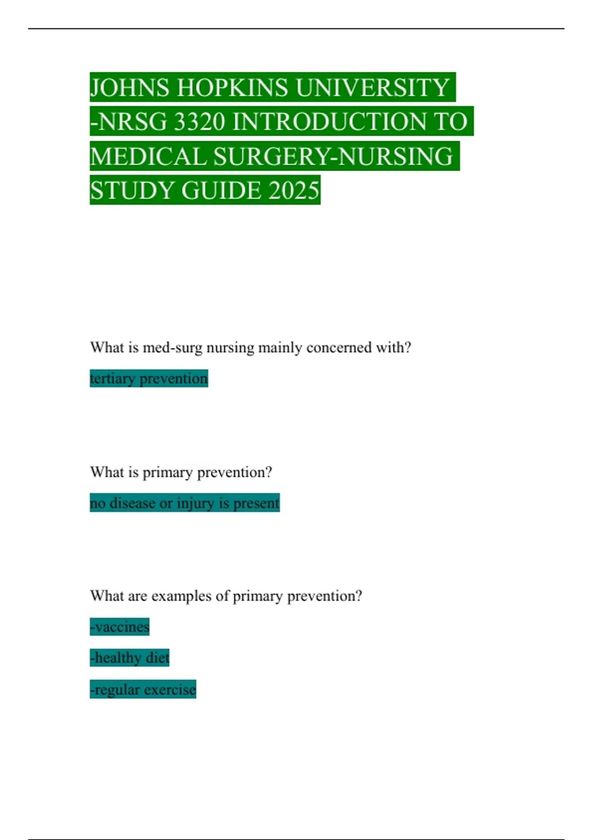 JOHNS HOPKINS UNIVERSITY -NRSG 3320 INTRODUCTION TO MEDICAL SURGERY-NURSING STUDY GUIDE 2025 What is med-surg nursing mainly concerned with? tertiary prevention What is primary prevention? no disease or injury is present What are examples of primary prevention? -vaccines -healthy diet -regular exercise What is secondary prevention? early detection and treatment before disease becomes symptomatic, no symptoms