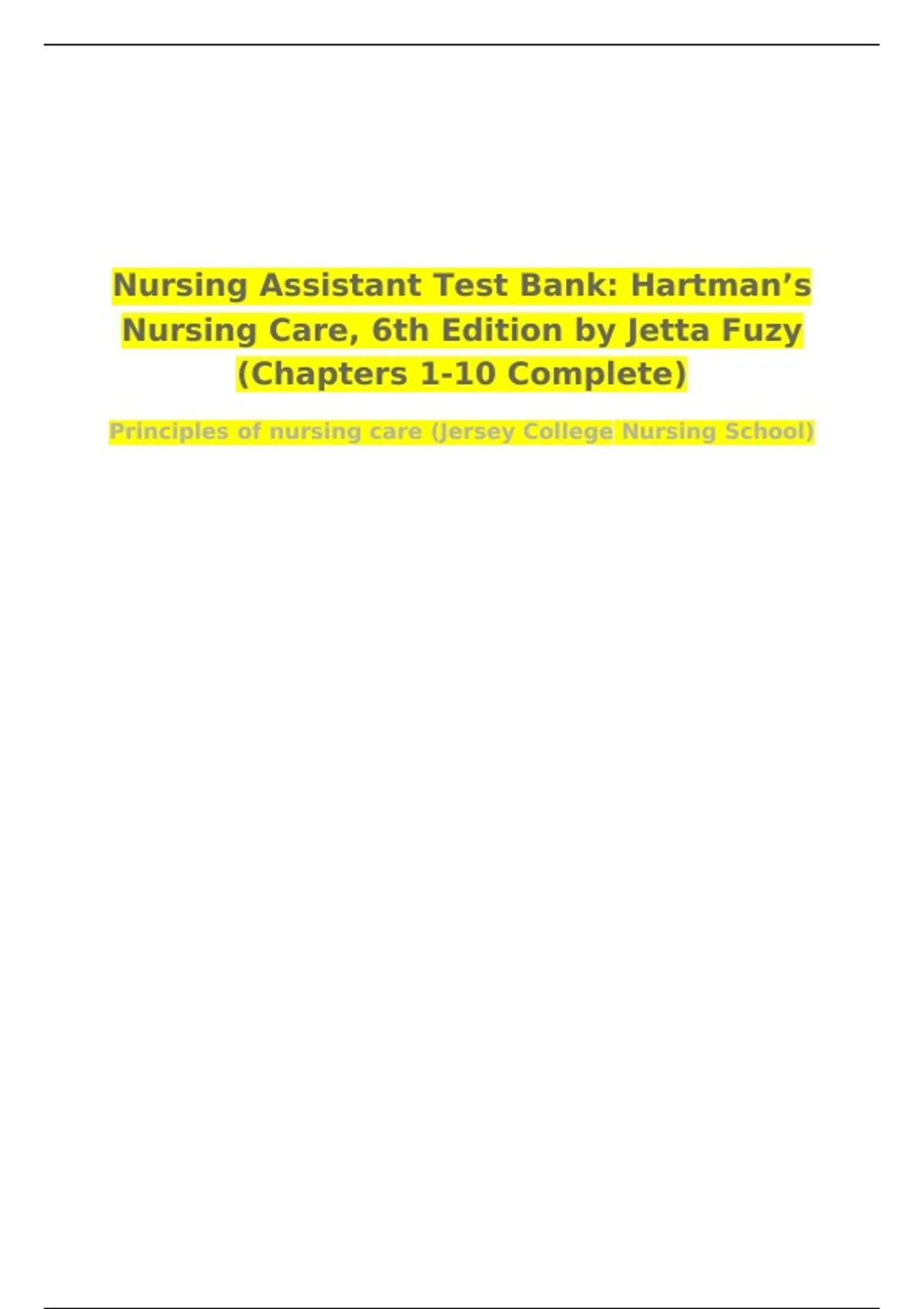 Nursing Assistant Test Bank: Hartman’s Nursing Care, 6th Edition by Jetta Fuzy (Chapters 1-10 Complete) Principles of nursing care (Jersey College Nursing School)