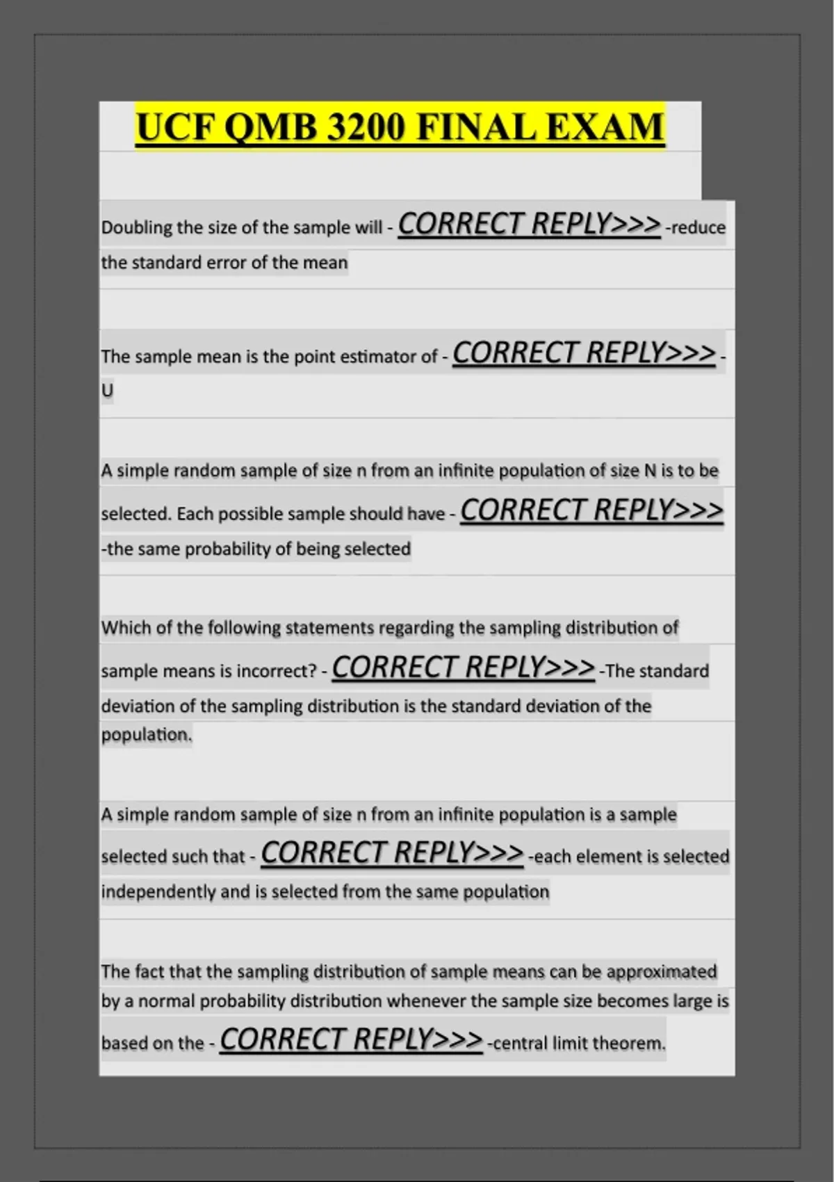 UCF QMB 3200 FINAL EXAM Doubling the size of the sample will - CORRECT REPLY>>> -reduce the standard error of the mean The sample mean is the point estimator of - CORRECT REPLY>>> U A simple random sample of size n from an infinite population of size N is to be selected. Each possible sample should have - CORRECT REPLY>>> -the same probability of being selected Which of the following statements regarding the sampling distribution of sample means is incorrect? - CORRECT REPLY>>> -The standard deviation of the sampling distribution is the standard deviation of the population. A simple random sample of size n from an infinite population is a sample selected such that - CORRECT REPLY>>> -each element is selected independently and is selected from the same population The fact that the sampling distribution of sample means can be approximated by a normal probability distribution whenever the sample size becomes large is based on the - CORRECT REPLY>>> -central limit theorem.