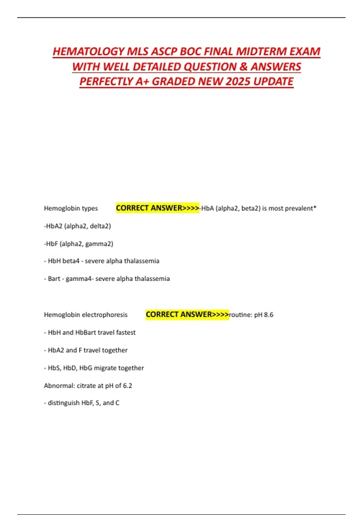 Hemoglobin types CORRECT ANSWER>>>>-HbA (alpha2, beta2) is most prevalent*