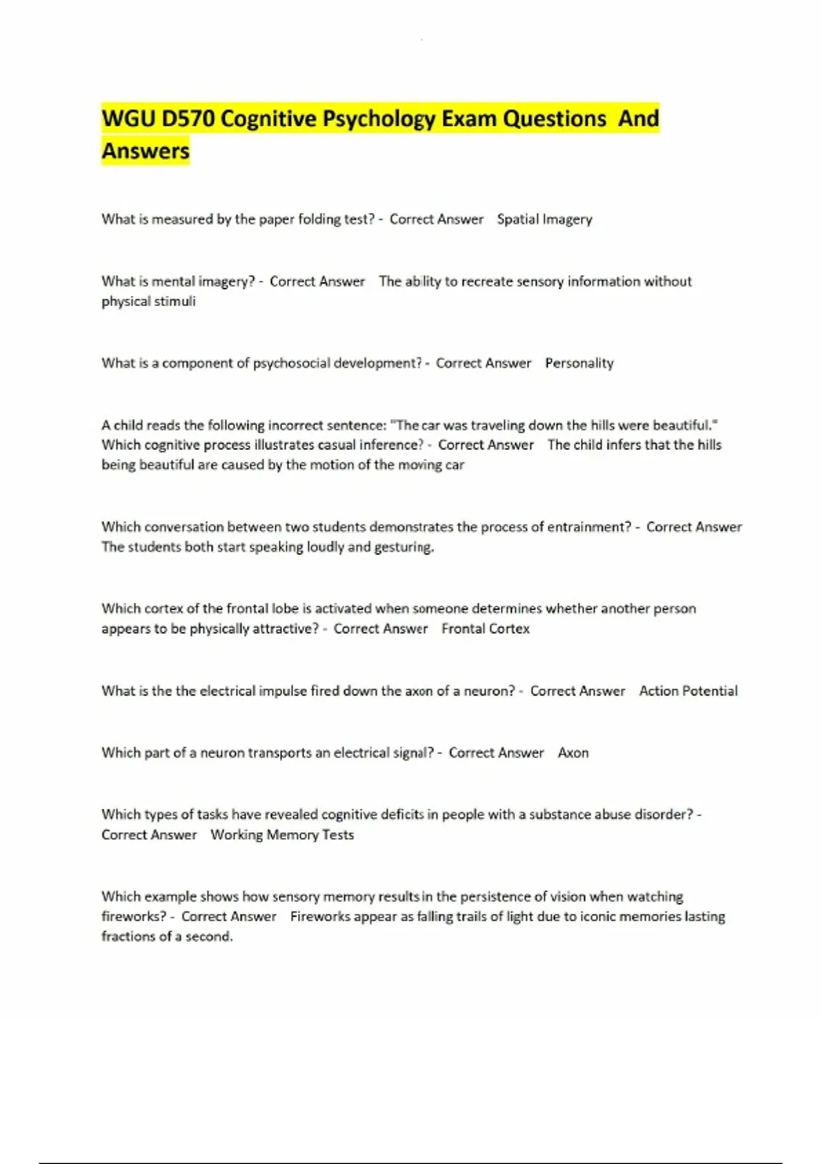 WGU D570 Cognitive Psychology Exam Questions And Answers What is measured by the paper folding test? - Correct Answer Spatial Imagery What is mental imagery? - Correct Answer The ability to recreate sensory information without physical stimuli What is a component of psychosocial development? - Correct Answer Personality A child reads the following incorrect sentence: "The car was traveling down the hills were beautiful." Which cognitive process illustrates casual inference? - Correct Answer The child infers that the hills being beautiful are caused by the motion of the moving car Which conversation between two students demonstrates the process of entrainment? - Correct Answer The students both start speaking loudly and gesturing. Which cortex of the frontal lobe is activated when someone determines whether another person appears to be physically attractive? - Correct Answer Frontal Cortex What is the the electrical impulse fired down the axon of a neuron? - Correct Answer Action Potential