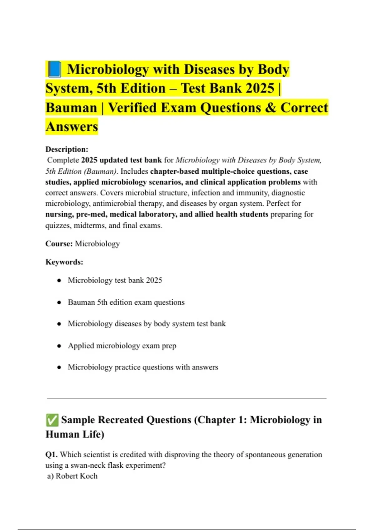 Complete 2025 updated test bank for Microbiology with Diseases by Body System,