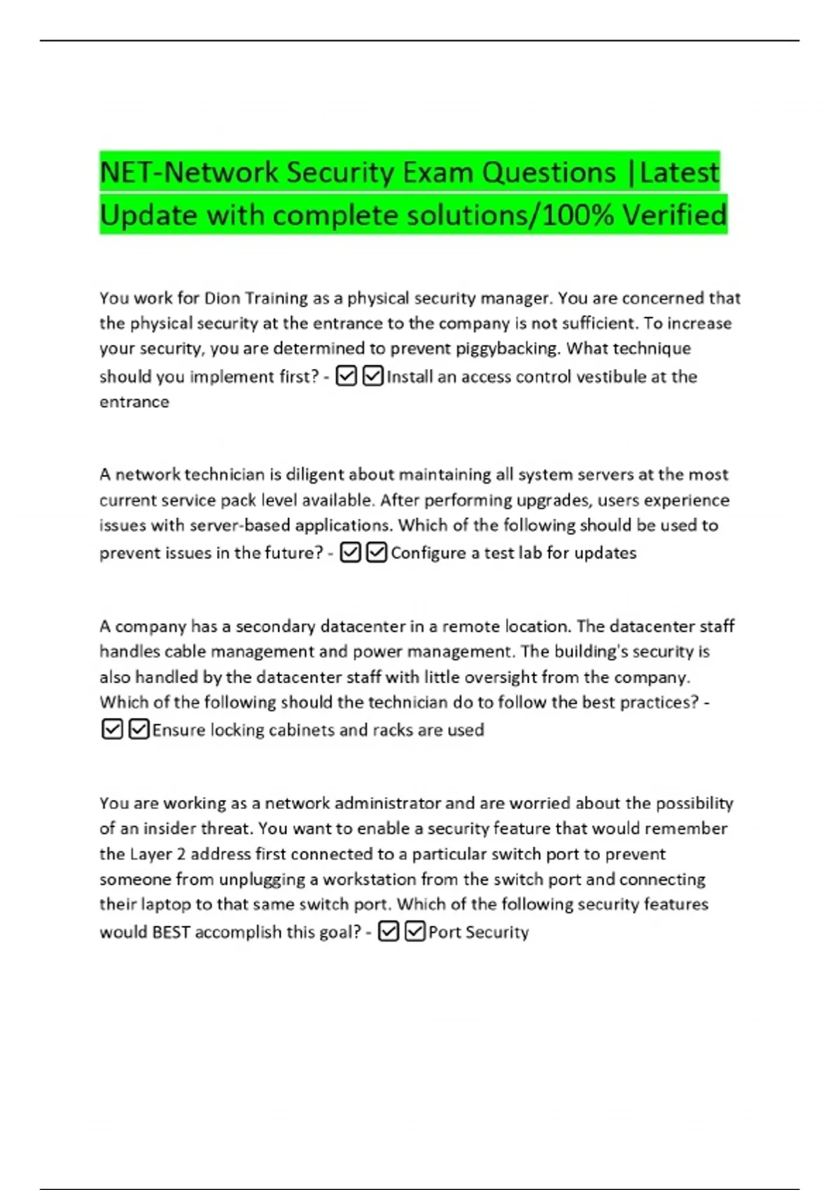 NET-Network Security Exam Questions |Latest Update with complete solutions/100% Verified You work for Dion Training as a physical security manager. You are concerned that the physical security at the entrance to the company is not sufficient. To increase your security, you are determined to prevent piggybacking. What technique should you implement first? -Install an access control vestibule at the entrance
