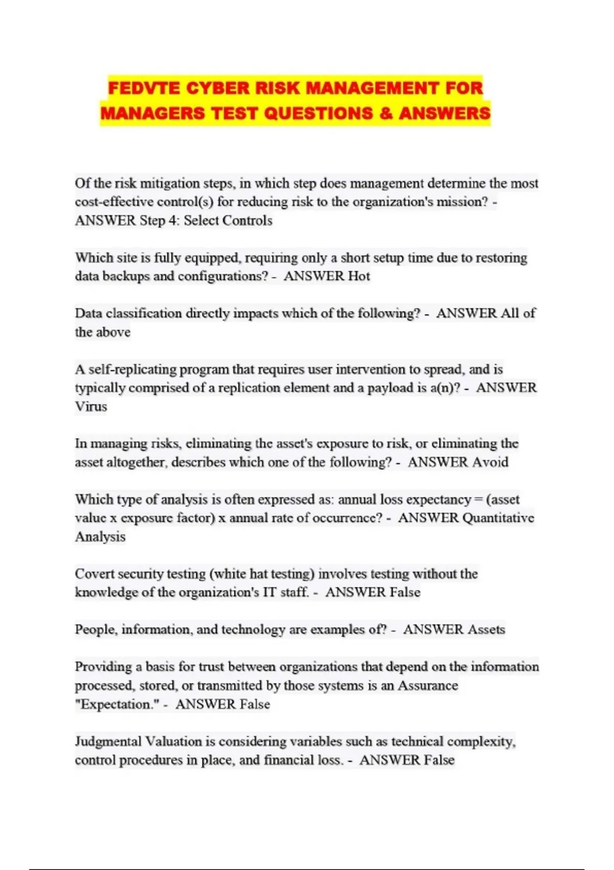 FEDVTE CYBER RISK MANAGEMENT FOR MANAGERS TEST QUESTIONS & ANSWERS...