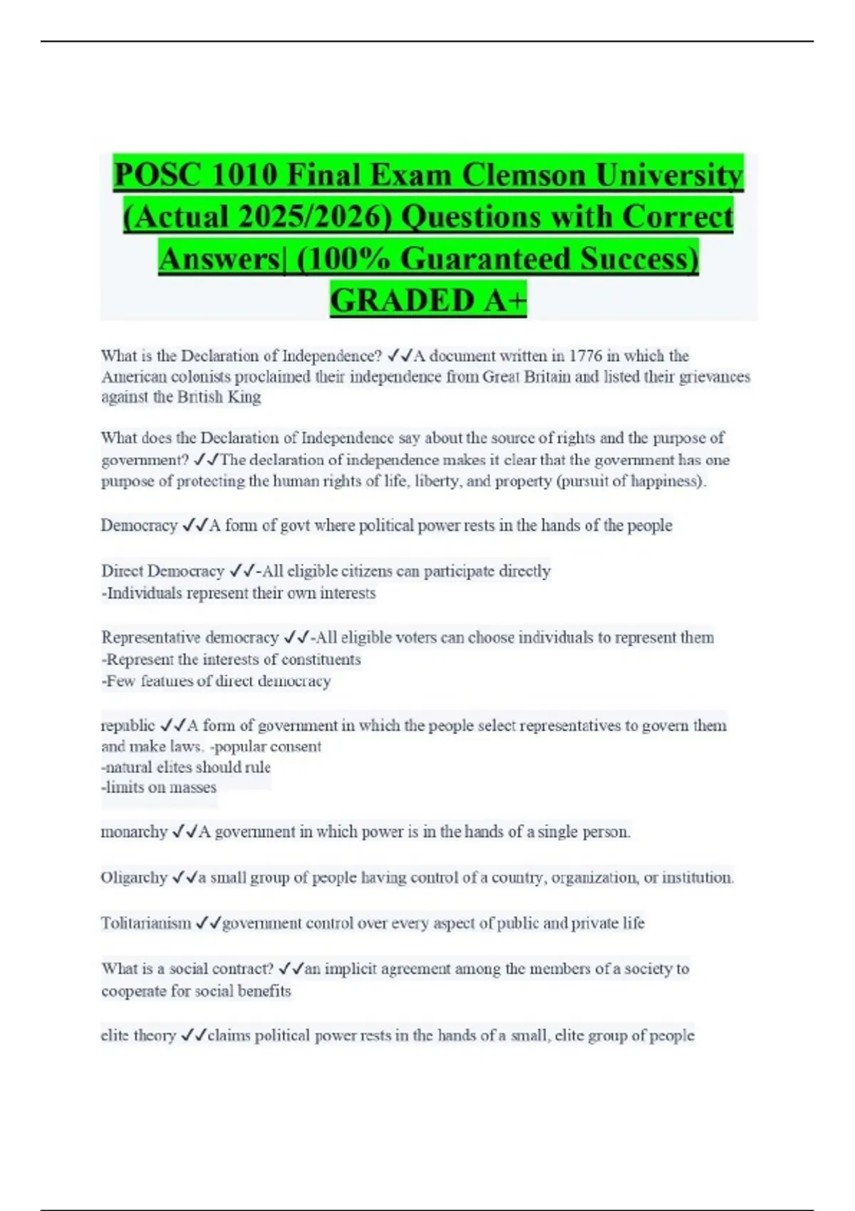 POSC 1010 Final Exam Clemson University (Actual 2025/2026) Questions with Correct Answers| (100% Guaranteed Success) GRADED A+ What is the Declaration of Independence? A document written in 1776 in which the American colonists proclaimed their independence from Great Britain and listed their grievances against the British King What does the Declaration of Independence say about the source of rights and the purpose of government? The declaration of independence makes it clear that the government has one purpose of protecting the human rights of life, liberty, and property (pursuit of happiness). Democracy A form of govt where political power rests in the hands of the people Direct Democracy -All eligible citizens can participate directly -Individuals represent their own interests Representative democracy -All eligible voters can choose individuals to represent them -Represent the interests of constituents -Few features of direct democracy