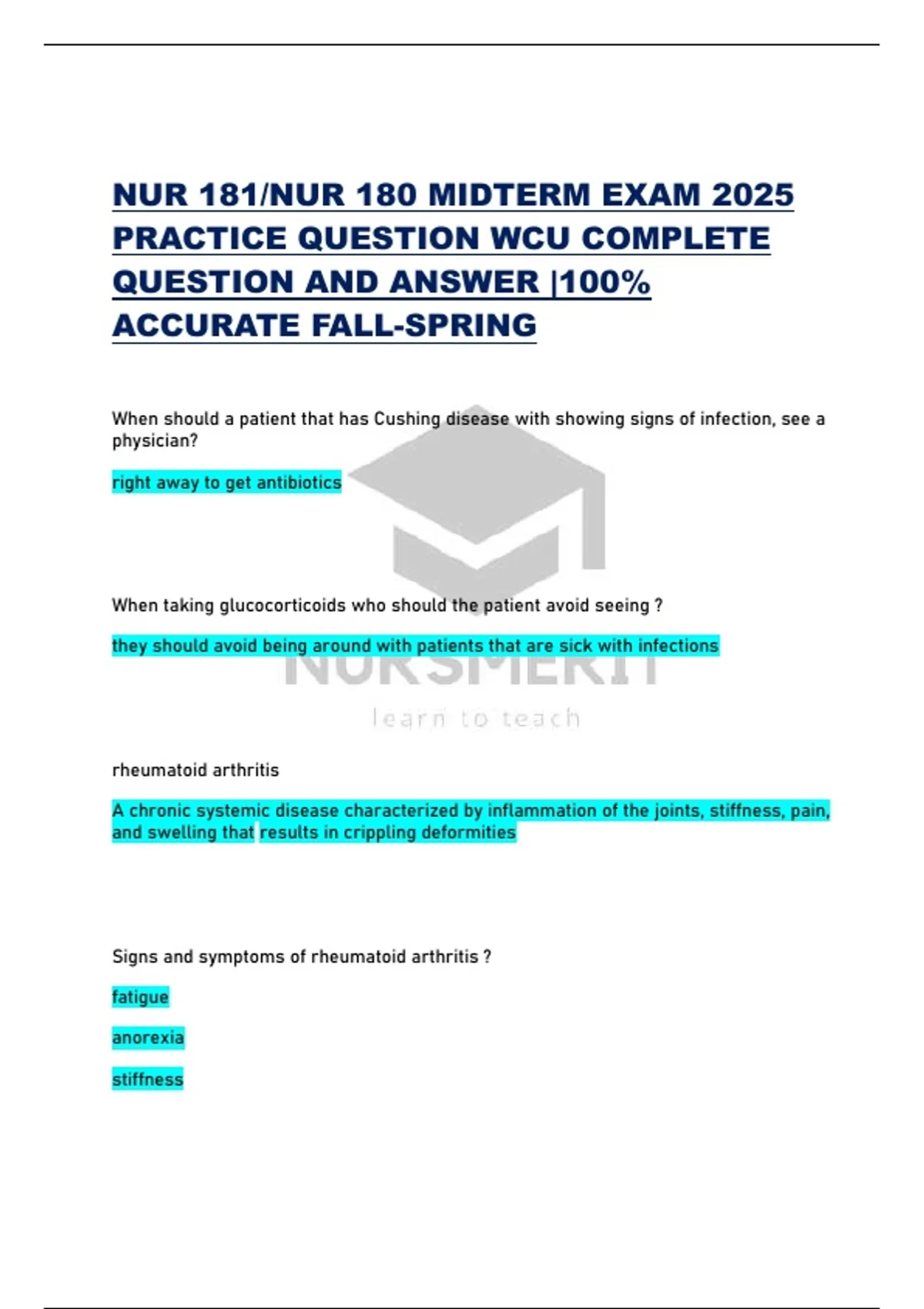 NUR 181/NUR 180 MIDTERM EXAM 2025 PRACTICE QUESTION WCU COMPLETE QUESTION AND ANSWER |100% ACCURATE FALL-SPRING