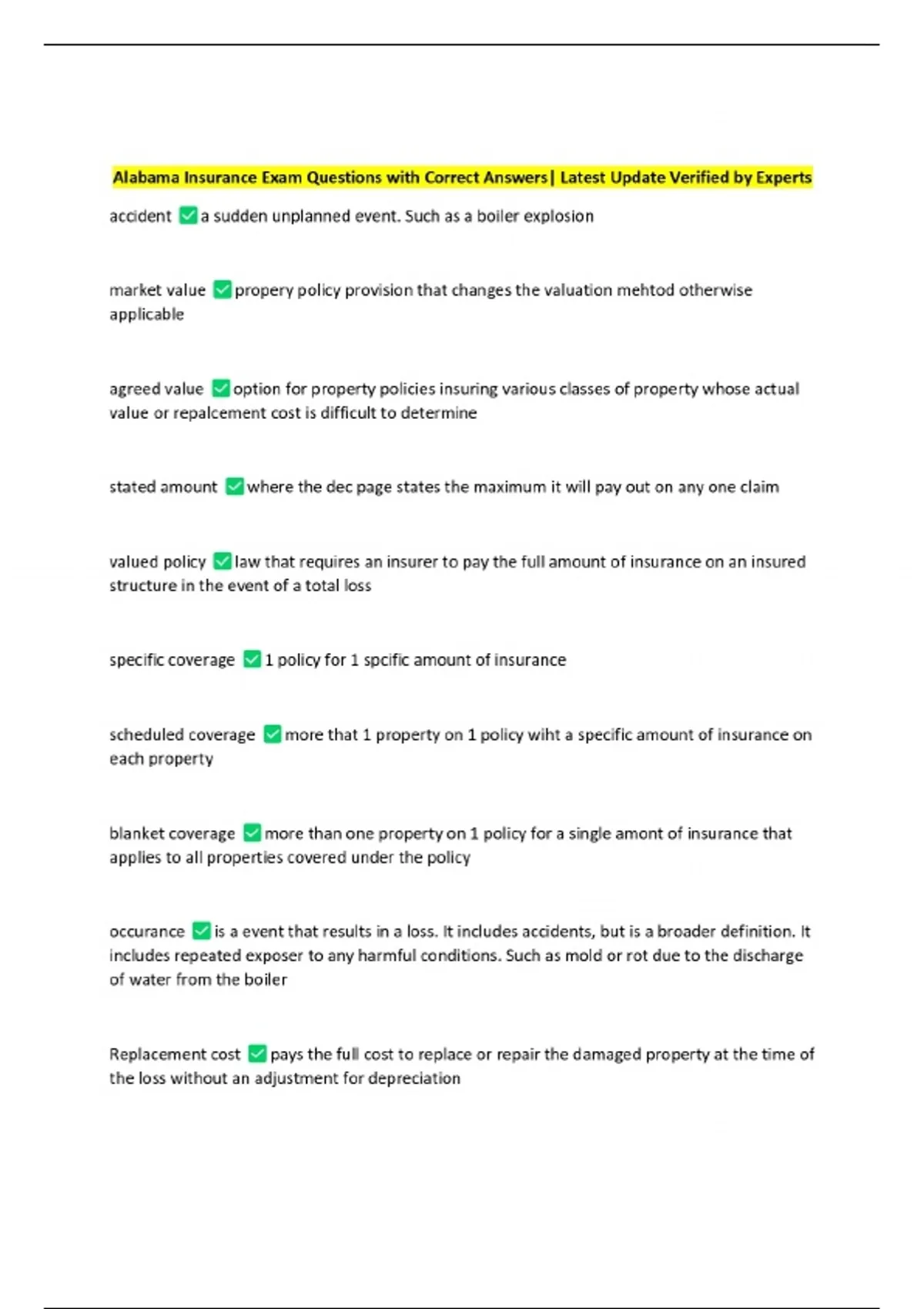Alabama Insurance Exam Questions with Correct Answers| Latest Update Verified by Experts