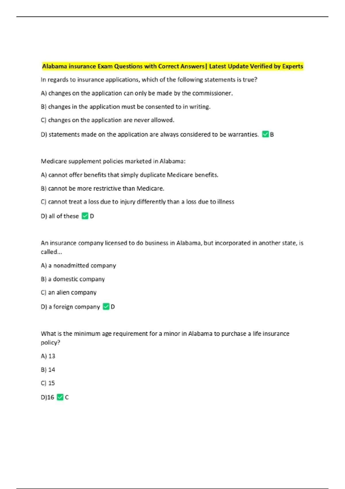 Alabama insurance Exam Questions with Correct Answers| Latest Update Verified by Experts