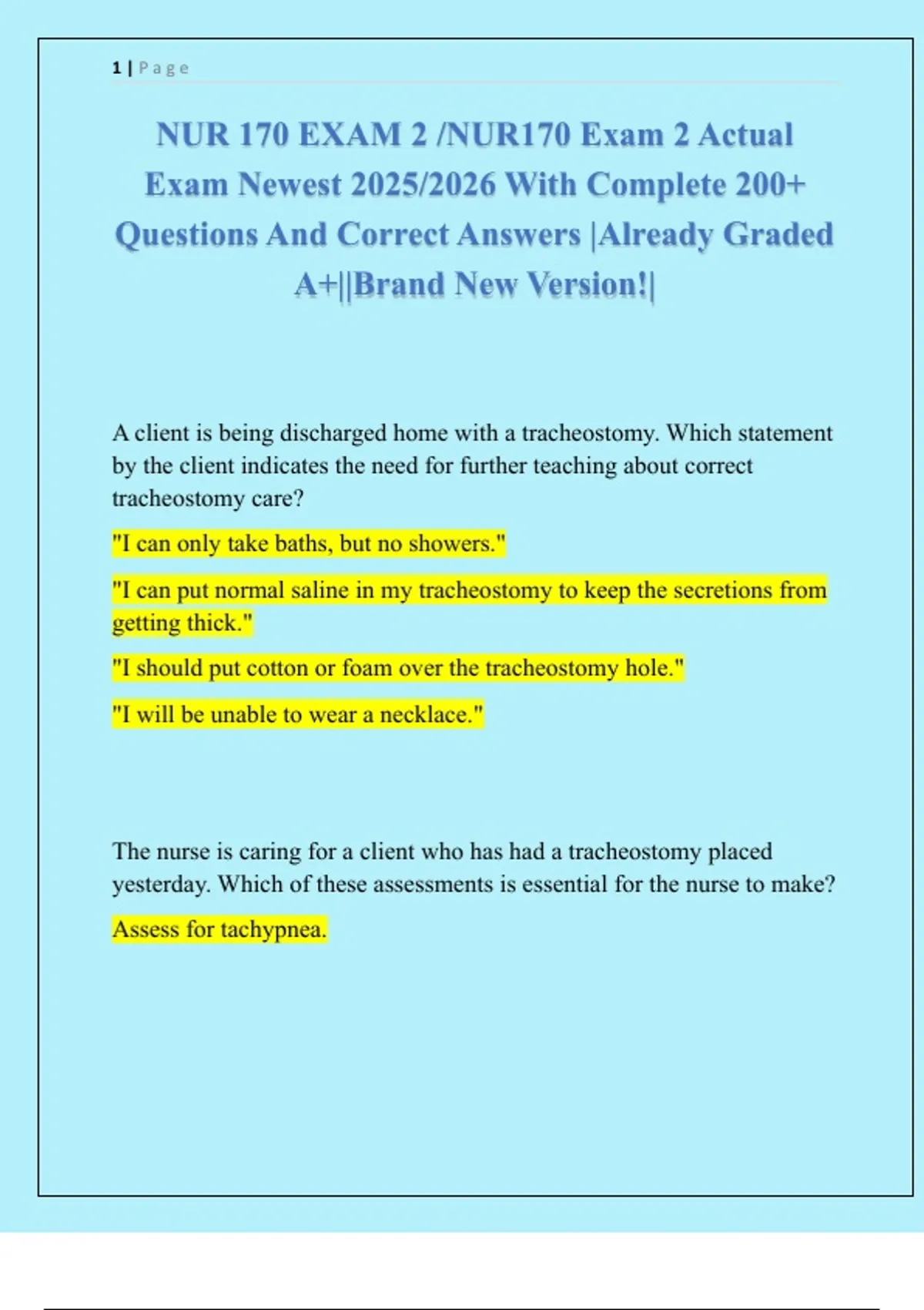 NUR 170 EXAM 2 /NUR170 Exam 2 Actual