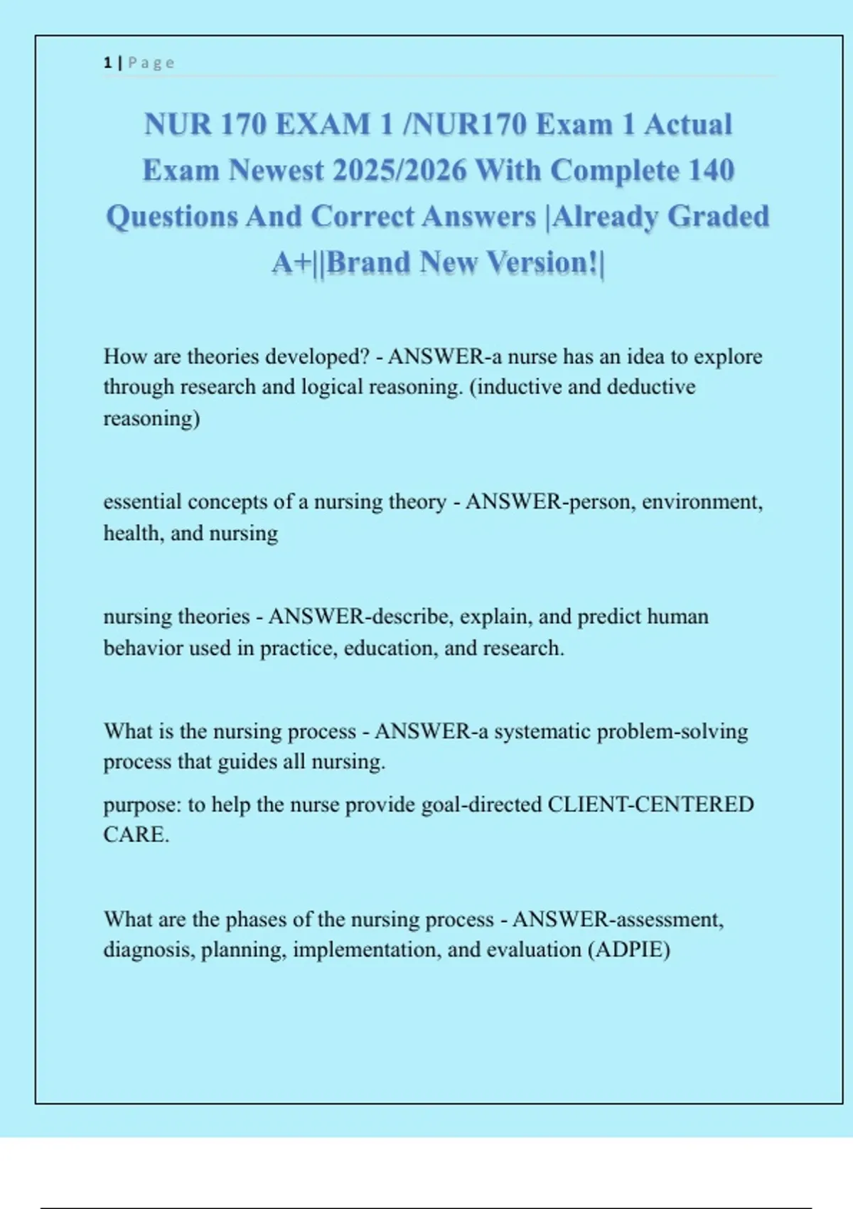 NUR 170 EXAM 1 /NUR170 Exam 1 Actual Exam Newest 2025/2026 With Complete 140 Questions And Correct Answers |Already Graded A+||Brand New Version!| How are theories developed? - ANSWER-a nurse has an idea to explore through research and logical reasoning. (inductive and deductive reasoning)