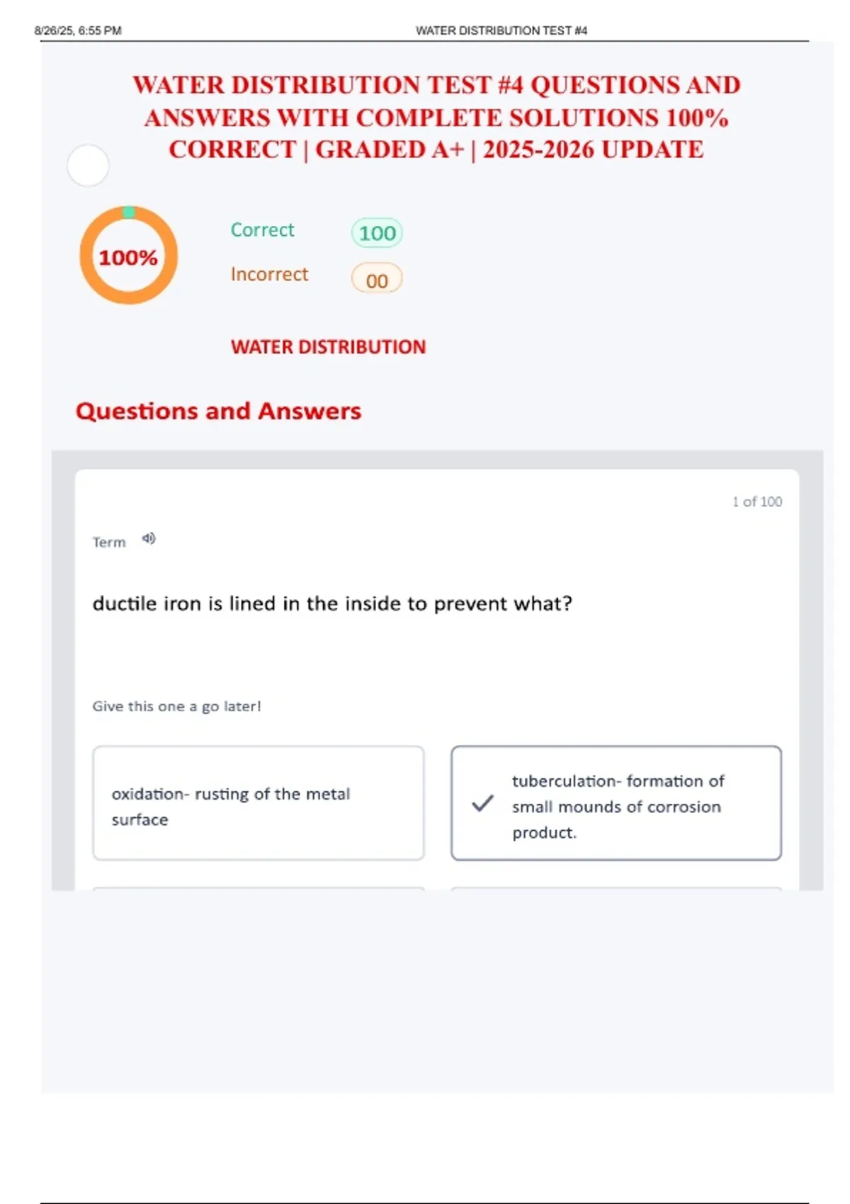 WATER DISTRIBUTION TEST #4 QUESTIONS AND ANSWERS WITH COMPLETE SOLUTIONS 100% CORRECT | GRADED A+ | UPDATE