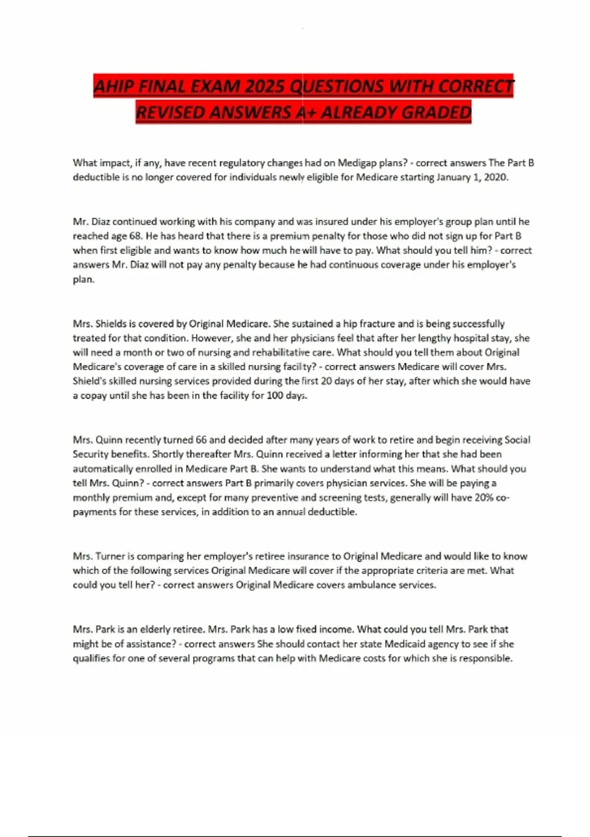 AHIP FINAL EXAM 2025 QUESTIONS WITH CORRECT REVISED ANSWERS A+ ALREADY GRAD What impact, if any, have recent regulatory changes had on Medigap plans? - correct answers The Part B deductible is no longer covered for individuals newly eligible for Medicare starting January 1, 2020. Mr. Diaz continued working with his company and was insured under his employer's group plan until he reached age 68. He has heard that there is a premium penalty for those who did not sign up for Part B when first eligible and wants to know how much he will have to pay. What should you tell him? - correct answers Mr. Diaz will not pay any penalty because he had continuous coverage under his employer's plan. Mrs. Shields is covered by Original Medicare. She sustained a hip fracture and is being successfully treated for that condition. However, she and her physicians feel that after her lengthy hospital stay, she will need a month or two of nursing and rehabilitative care. What should you tell them about Original Medicare's coverage of care in a skilled nursing facility? - correct answers Medicare will cover Mrs. Shield's skilled nursing services provided during the first 20 days of her stay, after which she would have a copay until she has been in the facility for 100 days.