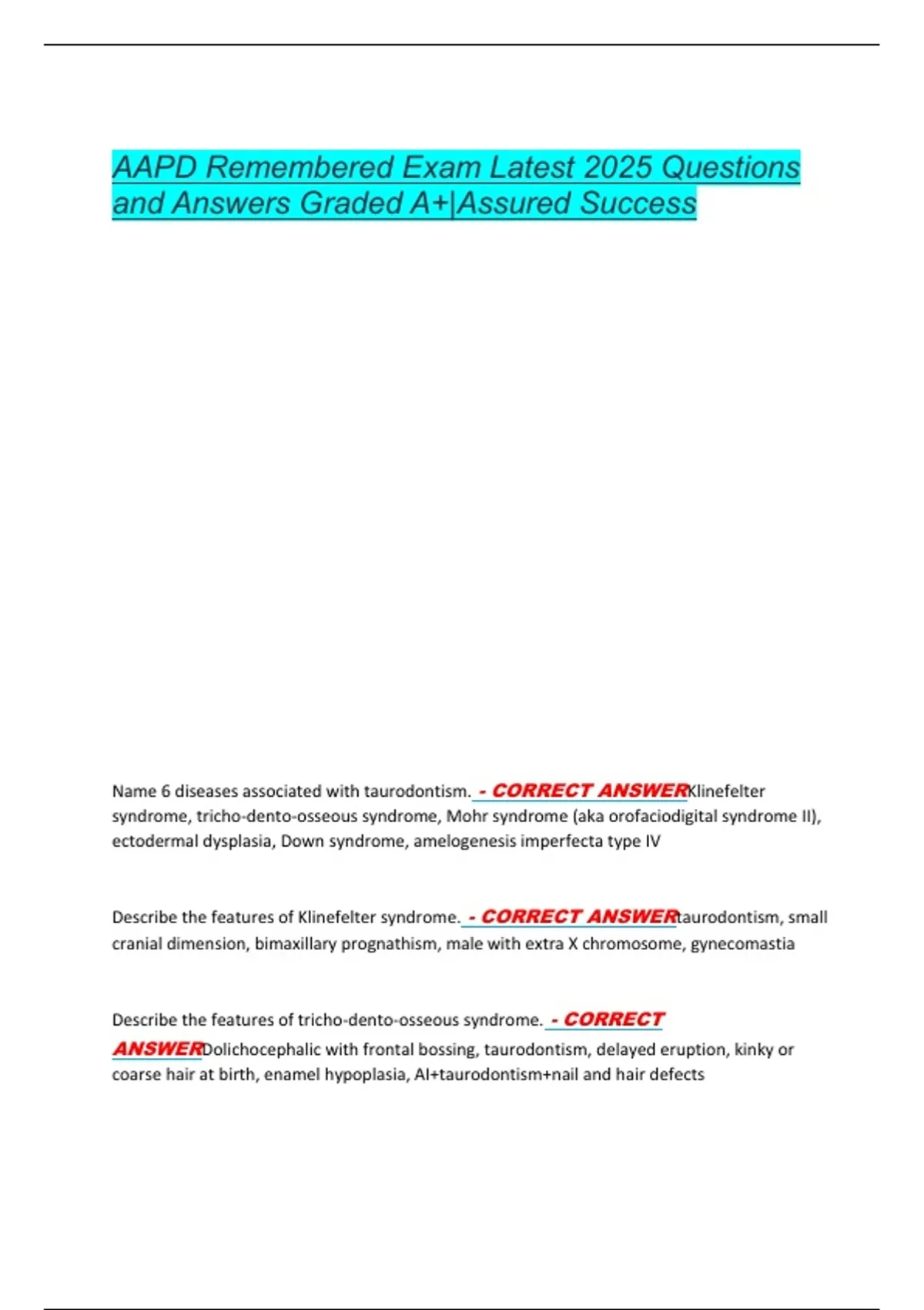 AAPD Remembered Exam Latest 2025 Questions and Answers Graded A+|Assured Success