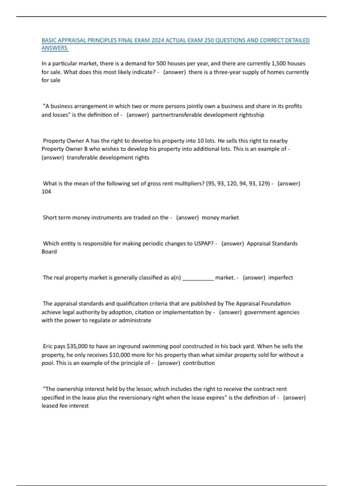 BASIC APPRAISAL PRINCIPLES FINAL EXAM 2024 ACTUAL EXAM 250 QUESTIONS AND CORRECT DETAILED