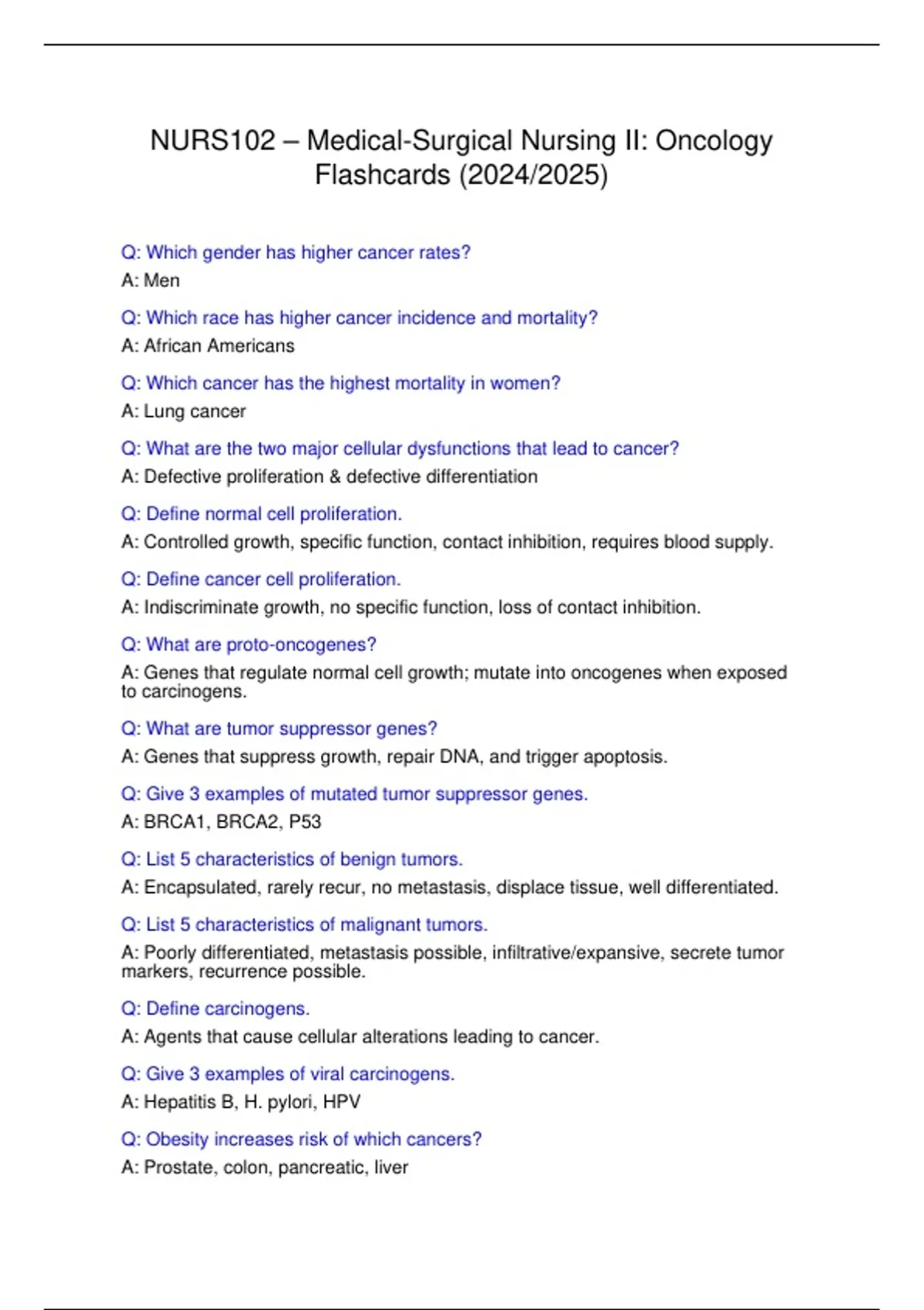 NURS102_MedSurg_Quick Revision Questions and Correct Answers Graded A plus. Q: Which gender has higher cancer rates? A: Men Q: Which race has higher cancer incidence and mortality? A: African Americans Q: Which cancer has the highest mortality in women? A: Lung cancer Q: What are the two major cellular dysfunctions that lead to cancer? A: Defective proliferation & defective differentiation