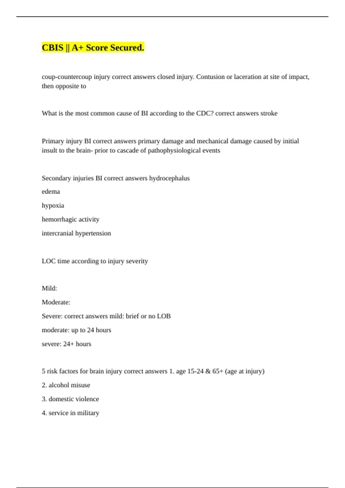 5 risk factors for brain injury correct answers 1. age 15-24 & 65+ (age at injury)