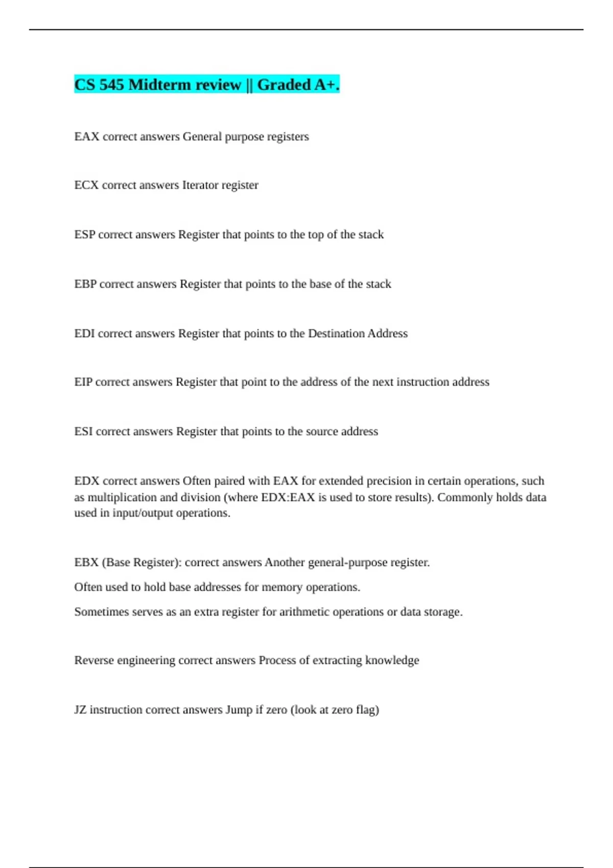 EAX correct answers General purpose registers ECX correct answers Iterator register ESP correct answers Register that points to the top of the stack EBP correct answers Register that points to the base of the stack EDI correct answers Register that points to the Destination Address EIP correct answers Register that point to the address of the next instruction address ESI correct answers Register that points to the source address EDX correct answers Often paired with EAX for extended precision in certain operations, such as multiplication and division (where EDX:EAX is used to store results). Commonly holds data used in input/output operations. EBX (Base Register): correct answers Another general-purpose register. Often used to hold base addresses for memory operations. Sometimes serves as an extra register for arithmetic operations or data storage. Reverse engineering correct answers Process of extracting knowledge JZ instruction correct answers Jump if zero (look at zero flag)