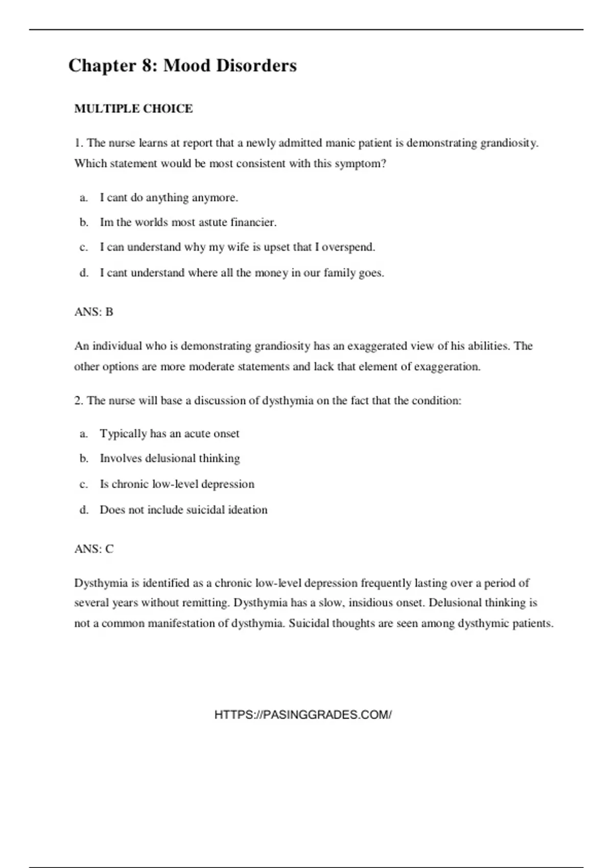 1. The nurse learns at report that a newly admitted manic patient is demonstrating grandiosity.
