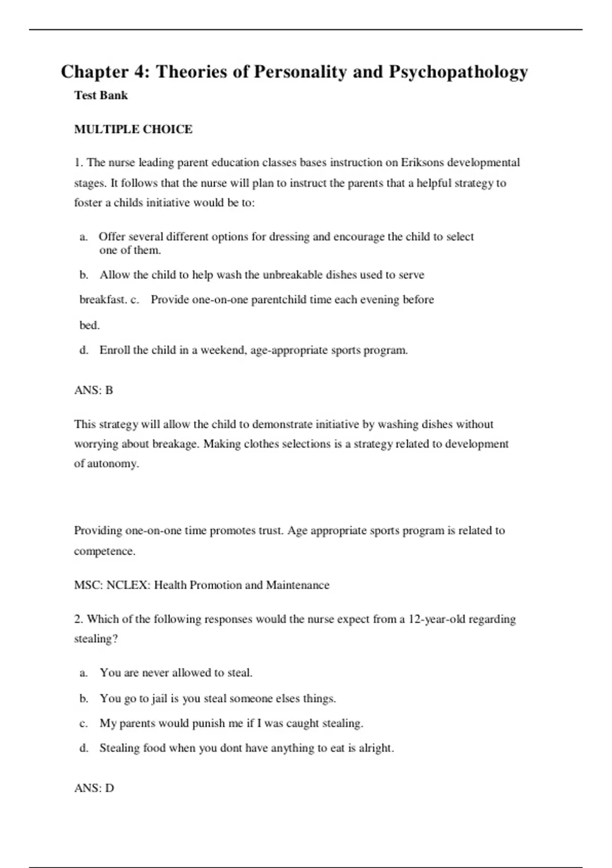 MSC: NCLEX: Health Promotion and Maintenance, Psychosocial Integrity