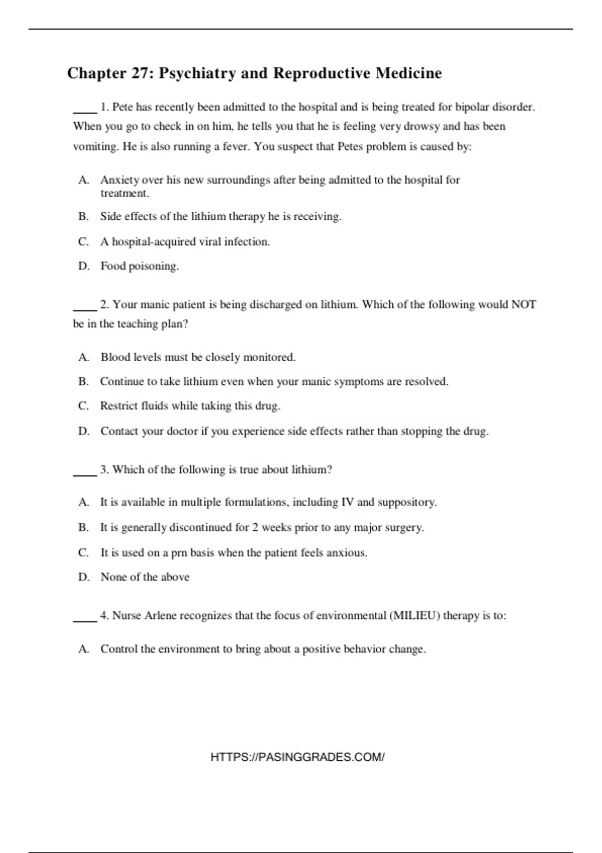 2. Your manic patient is being discharged on lithium. Which of the following would NOT
