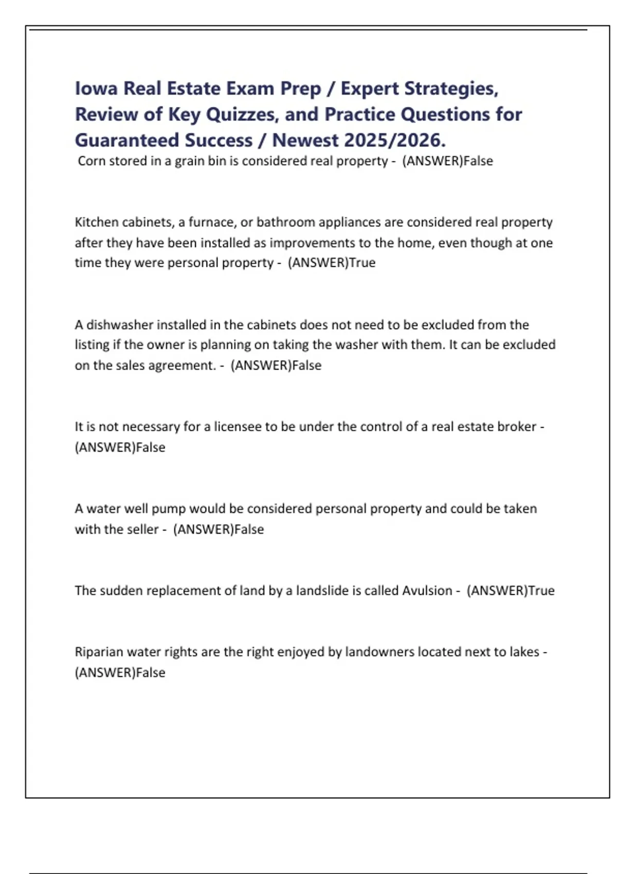 Corn stored in a grain bin is considered real property - (ANSWER)False