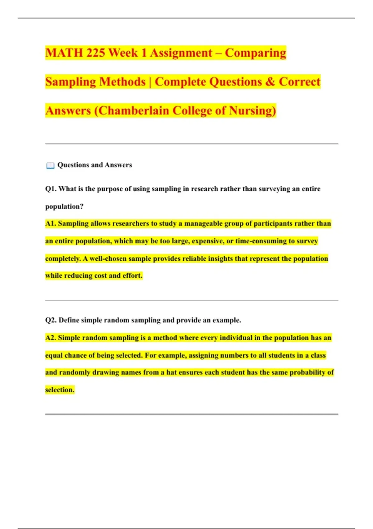 MATH 225 Week 1 Assignment – Comparing Sampling Methods | Complete Questions & Correct Answers (Chamberlain College of Nursing) Questions and Answers Q1. What is the purpose of using sampling in research rather than surveying an entire population? A1. Sampling allows researchers to study a manageable group of participants rather than an entire population, which may be too large, expensive, or time-consuming to survey completely. A well-chosen sample provides reliable insights that represent the population while reducing cost and effort. Q2. Define simple random sampling and provide an example. A2. Simple random sampling is a method where every individual in the population has an equal chance of being selected. For example, assigning numbers to all students in a class and randomly drawing names from a hat ensures each student has the same probability of selection. Q3. What is stratified sampling, and why is it useful in nursing research? A3. Stratified sampling involves dividing a population into subgroups (strata) based on shared characteristics (e.g., age, gender, diagnosis) and then sampling from each subgroup. In nursing research, it ensures representation of all important groups, improving accuracy when comparing health outcomes across demographics. Q4. Explain systematic sampling with an example. A4. Systematic sampling selects every kth individual from a list after choosing a random starting point. For example, if a hospital has 1,000 patients and a researcher needs 100, they could select every 10th patient from a randomly chosen starting number. Q5. Describe cluster sampling and provide a nursing-related example. A5. Cluster sampling divides a population into clusters (groups), then randomly selects entire clusters for study. For example, instead of sampling individual patients from all hospitals in a city, a researcher might randomly select 3 hospitals (clusters) and include all patients from those hospitals. Q6. Compare the advantages and disadvantages of stratified and cluster sampling. A6. Stratified sampling improves accuracy by ensuring representation of subgroups but can be time-consuming and requires detailed population data. Cluster sampling is more convenient and cost-effective, especially for large populations, but may introduce bias if selected clusters are not truly representative. Q7. Which sampling method is best suited for a nationwide nursing survey, and why? A7. Cluster sampling is often best for nationwide surveys because it reduces cost and logistics by selecting groups (e.g., hospitals or regions) rather than individuals across the whole country. However, researchers may combine cluster with stratified sampling for better representation.