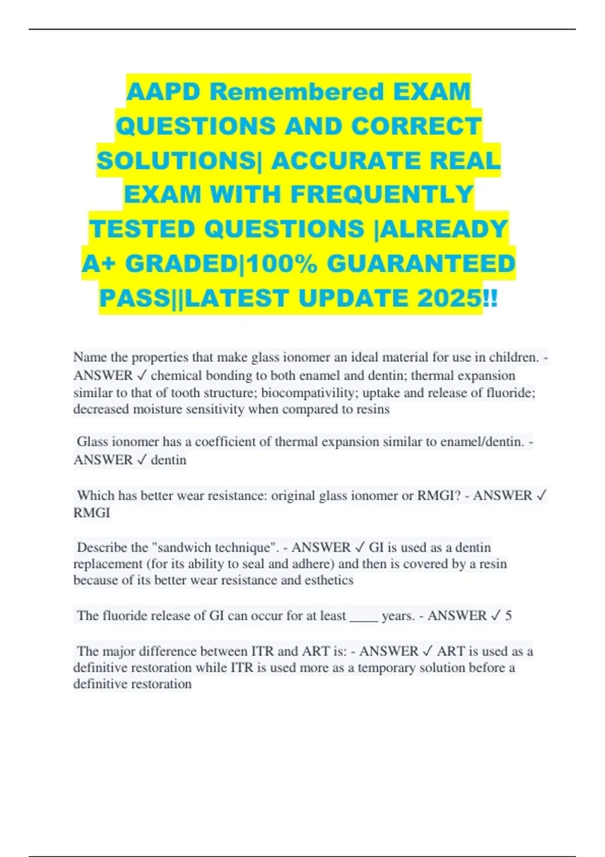 AAPD Remembered EXAM QUESTIONS AND CORRECT SOLUTIONS| ACCURATE REAL EXAM WITH FREQUENTLY TESTED QUESTIONS |ALREADY A+ GRADED|100% GUARANTEED PASS||LATEST UPDATE 2025!! Name the properties that make glass ionomer an ideal material for use in children. - ANSWER chemical bonding to both enamel and dentin; thermal expansion similar to that of tooth structure; biocompativility; uptake and release of fluoride; decreased moisture sensitivity when compared to resins Glass ionomer has a coefficient of thermal expansion similar to enamel/dentin. - ANSWER dentin Which has better wear resistance: original glass ionomer or RMGI? - ANSWER RMGI Describe the "sandwich technique". - ANSWER GI is used as a dentin replacement (for its ability to seal and adhere) and then is covered by a resin because of its better wear resistance and esthetics The fluoride release of GI can occur for at least ____ years. - ANSWER 5 The major difference between ITR and ART is: - ANSWER ART is used as a definitive restoration while ITR is used more as a temporary solution before a definitive restoration Describe the resin infiltration technique. - ANSWER uses a specialized interproximal matrix; treat the surface of a non-cavitated carious lesion with hydrochloric acid; desiccate the surface with air, then ethanol; infiltrate, via capillary action over several minutes and 2 applications, an unfilled "fluid" resin to the extent of the DEJ or slightly beyond; polymerize the resin with light Microfilled resins have filler sizes less than ____. - ANSWER 0.1 micron Minifilled particle sizes range from ______. - ANSWER 0.1 to 1 micron Midsize resin particles range from ____. - ANSWER 1 to 10 microns Macrofilled particles range from ____ - ANSWER 10 to 100 microns When does the AAPD advocate the use of SSCs to restore primary anterior teeth? - ANSWER multiple surfaces are carious, where there is incisal edge involvement, following pulp therapy, when hypoplasia is present and when there is poor moisture control How often should radographic evaluation of primary tooth pulpotomies occur? - ANSWER at least annually Name some material which are appropriate to act as a liner. - ANSWER CaOH, dentin bonding agent, GI cement What are the benefits of indirect pulp capping over pulpotomy? - ANSWER higher success rate long term; normal exfoliation time Name some materials which are appropriate for direct pulp capping. - ANSWER MTA; CaOH Name the indications for primary tooth pulpectomy. - ANSWER irreversible pulpitis or necrosis or a tooth treatment planned for pulpotomy in which the radicular pulp exhibits clinical signs of irreversible pulpitis (excessive hemorrhage) or pulp necrosis (suppuration, purulence) with minimal or no root resorption Describe the 2-step process in indirect pulp treatment of a permanent tooth. - ANSWER 1) removal of carious dentin along DEJ with excavation of only the outermost infected dentin (change the cariogenic environment, decrease number of bacteria, close th remaining caries from the biofilm, slow/arrest caries development); 2) removal of the remaining caries and placement of a final restoration What time period is recommended between the two steps of the 2-step indirect pulp treatment of a permanent tooth? - ANSWER 3-6 months To what depth should inflamed pulp tissue be removed in a partial pulpotomy due to carious exposure in a permanent tooth? - ANSWER 1-3 mm How should you control pulpal bleeding in a partial pulpotomy of a permanent tooth? - ANSWER irrigation with sodium hypochlorite or chlorhexidine What materials are recommended to perform a partial pulpotomy of a permanent tooth? - ANSWER CaOH; MTA Which partial pulpotomy material has a record of longer success? - ANSWER CaOH What are the benefits of MTA over CaOH as a partial pulpotomy material? - ANSWER more predictable dentin bridging; more predictable pulpal health What is the recommended thickness of MTA used in a partial pulpotomy? - ANSWER 1.5 mm+ followed by a layer of light-cured RMGI Describe an apexification procedure. - ANSWER removal of coronal and nonvital radicular tissue just short of the root end and placing a biocompatible agent such as CaOH in the canals for 2-4 weeks to disinfect; root end closure accomplished with MTA or if this is not possible an absorbable collagen wound dressing such as Colla-Cote can be placed at the root end to allow MTA to be packed within the confines of the canal space; gutta percha used to fill the canal space or if the canal walls are the, the canal space can be filled with MTA or resin to strengthen the tooth against fracture When is the primary anterior dentition at risk for space loss when a tooth is avulsed? - ANSWER prior to the eruption of the canine or if the dentition is already crowded Name the characteristics of the ideal splint following trauma. - ANSWER easily fabricated in the mouth without additional trauma; passive unless orthodontic forces are intended; allows physiologic mobility; nonirritating to soft tissues; does not interfere with occlusion; allows endodontic access and vitality testing; easily cleansed; easily removed Define infraction. - ANSWER incomplete fracture of the enamel without loss of tooth structure What is the difference between a complicated and an uncomplicated crown fracture? - ANSWER complicated crown fracture involves pulp exposure Define concussion (in a dental/trauma oriented manner). - ANSWER injury to the tooth-supporting structures without abnormal loosening or displacement of the tooth Define subluxation. - ANSWER injury to tooth-supporting structures with abnormal loosening but without tooth displacement What is the treatment protocol for a permanent tooth which has been subluxated due to trauma? - ANSWER stabilize the tooth and relieve any occlusal interferences; use a flexible splint and splint for no more than 2 weeks What is the treatment protocol for primary teeth that have experienced lateral luxation? - ANSWER allow passive or spontaenous repositioning 