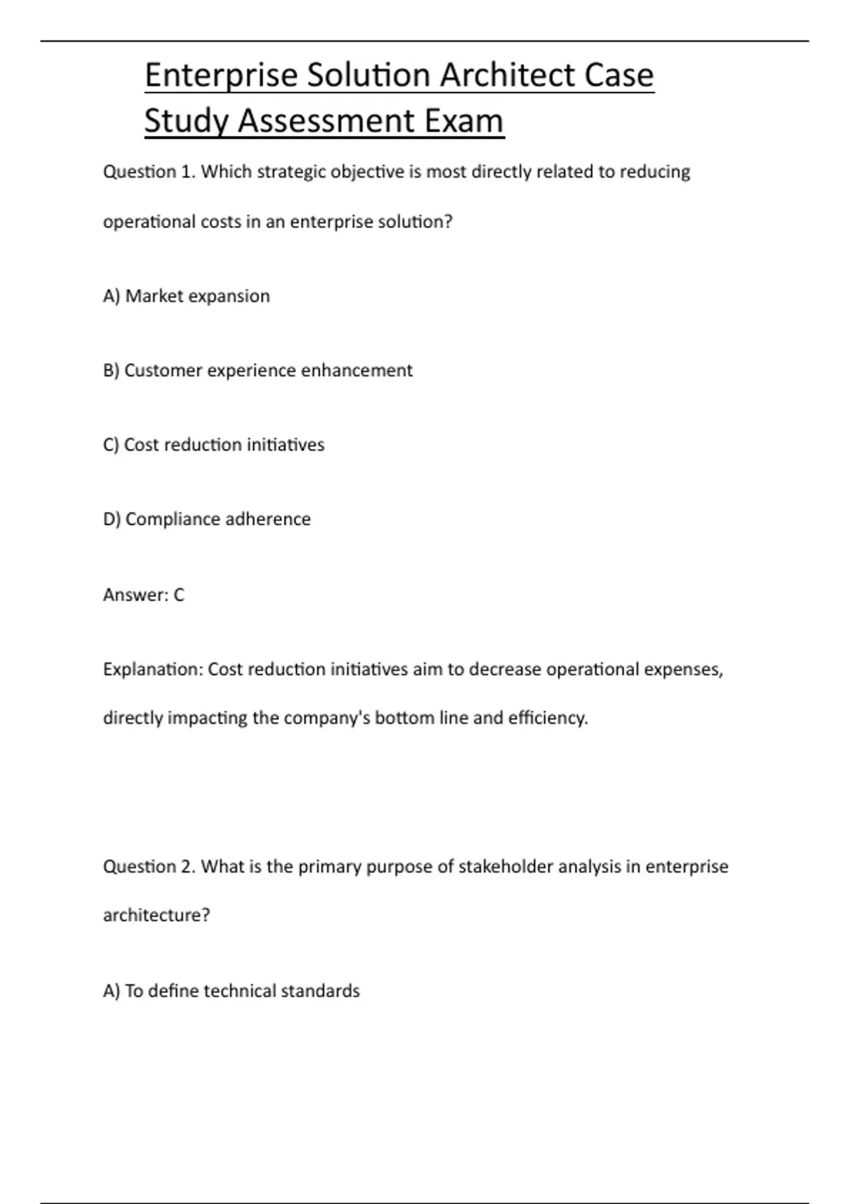 The Enterprise Solution Architect Case Study Assessment Exam is a scenario-driven evaluation designed for senior professionals in architecture and solution design roles. Candidates are presented with complex case studies requiring them to analyze business needs, define architecture strategies, and design robust, scalable, and secure enterprise solutions. The assessment focuses on integration of cloud, data, security, and application platforms into cohesive architectures that align with business objectives. It also evaluates stakeholder communication, risk management, and governance practices. Success in this exam validates the candidate’s ability to operate as a strategic solution architect capable of addressing real-world enterprise transformation challenges.