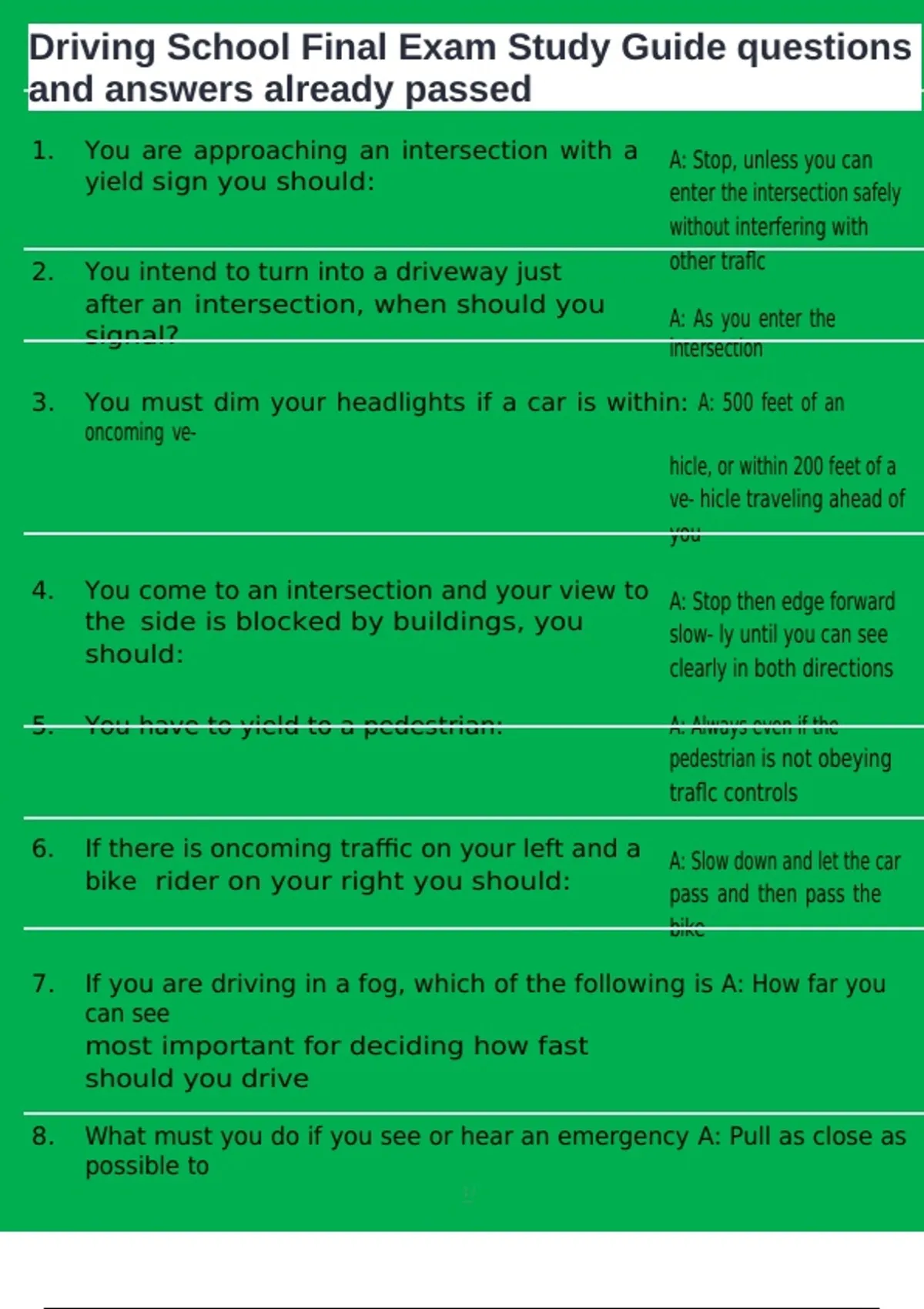 ,Driving School Final Exam Study Guide questions