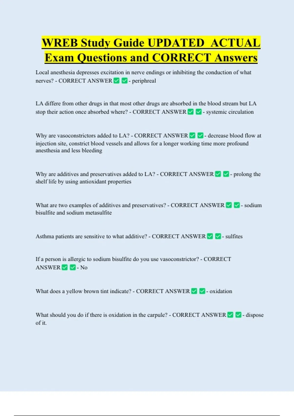 WREB Study Guide UPDATED ACTUAL Exam Questions and CORRECT Answers Local anesthesia depresses excitation in nerve endings or inhibiting the conduction of what nerves? - CORRECT ANSWER - periphreal LA differe from other drugs in that most other drugs are absorbed in the blood stream but LA stop their action once absorbed where? - CORRECT ANSWER - systemic circulation Why are vasoconstrictors added to LA? - CORRECT ANSWER - decrease blood flow at injection site, constrict blood vessels and allows for a longer working time more profound