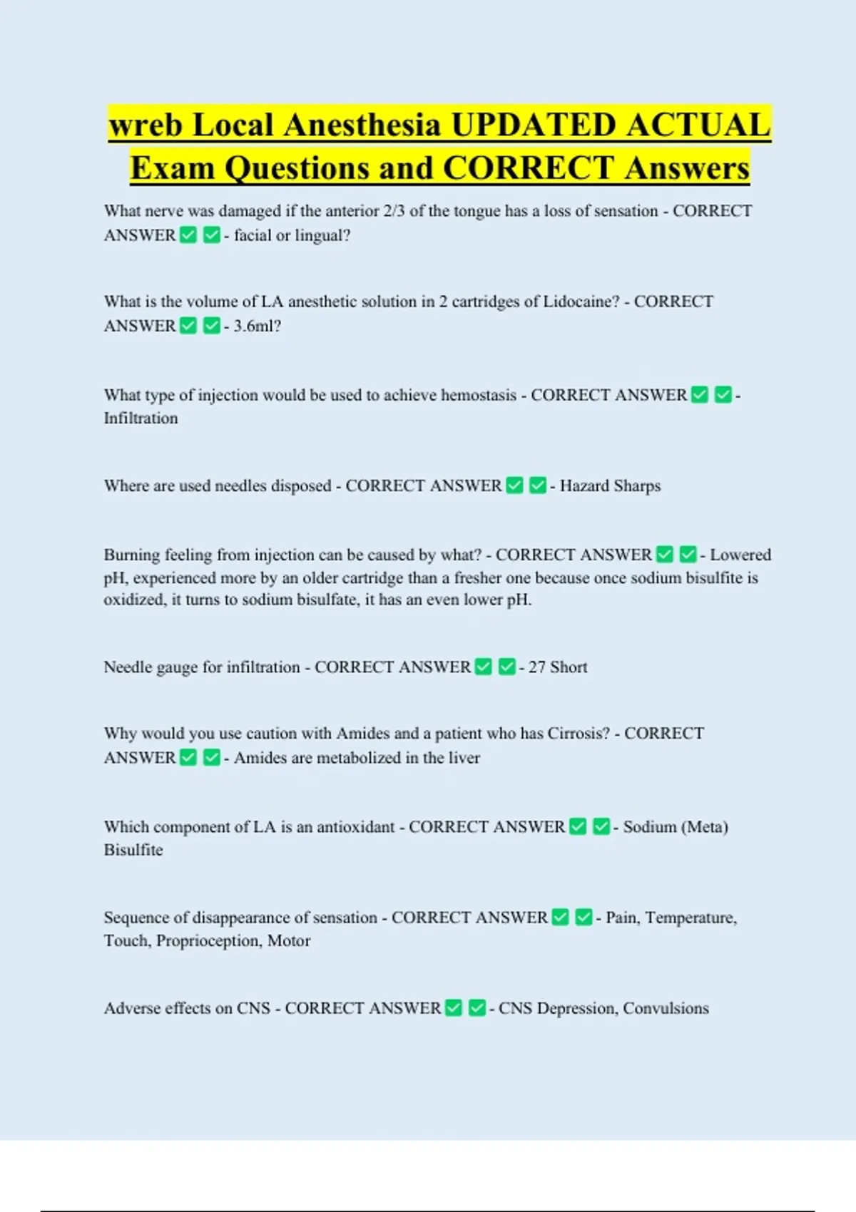 wreb Local Anesthesia UPDATED ACTUAL Exam Questions and CORRECT Answers
