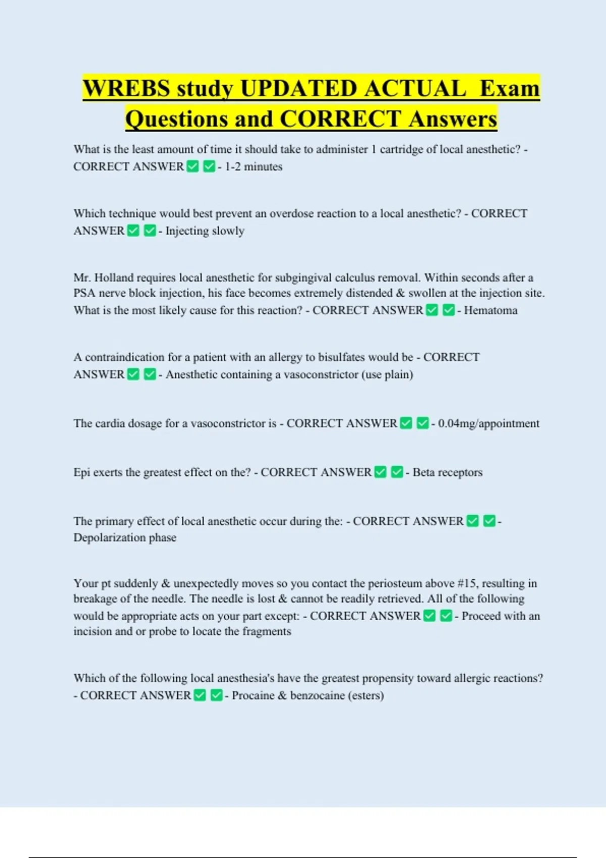 WREBS study UPDATED ACTUAL Exam Questions and CORRECT Answers What is the least amount of time it should take to administer 1 cartridge of local anesthetic? - CORRECT ANSWER - 1-2 minutes Which technique would best prevent an overdose reaction to a local anesthetic? - CORRECT ANSWER - Injecting slowly Mr. Holland requires local anesthetic for subgingival calculus removal. Within seconds after a PSA nerve block injection, his face becomes extremely distended & swollen at the injection site. What is the most likely cause for this reaction? - CORRECT ANSWER - Hematom