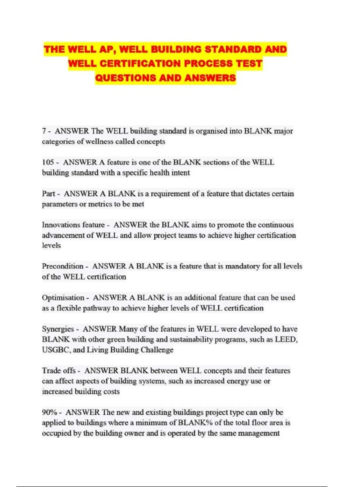 THE WELL AP, WELL BUILDING STANDARD AND WELL CERTIFICATION PROCESS TEST QUESTIONS AND ANSWERS.....