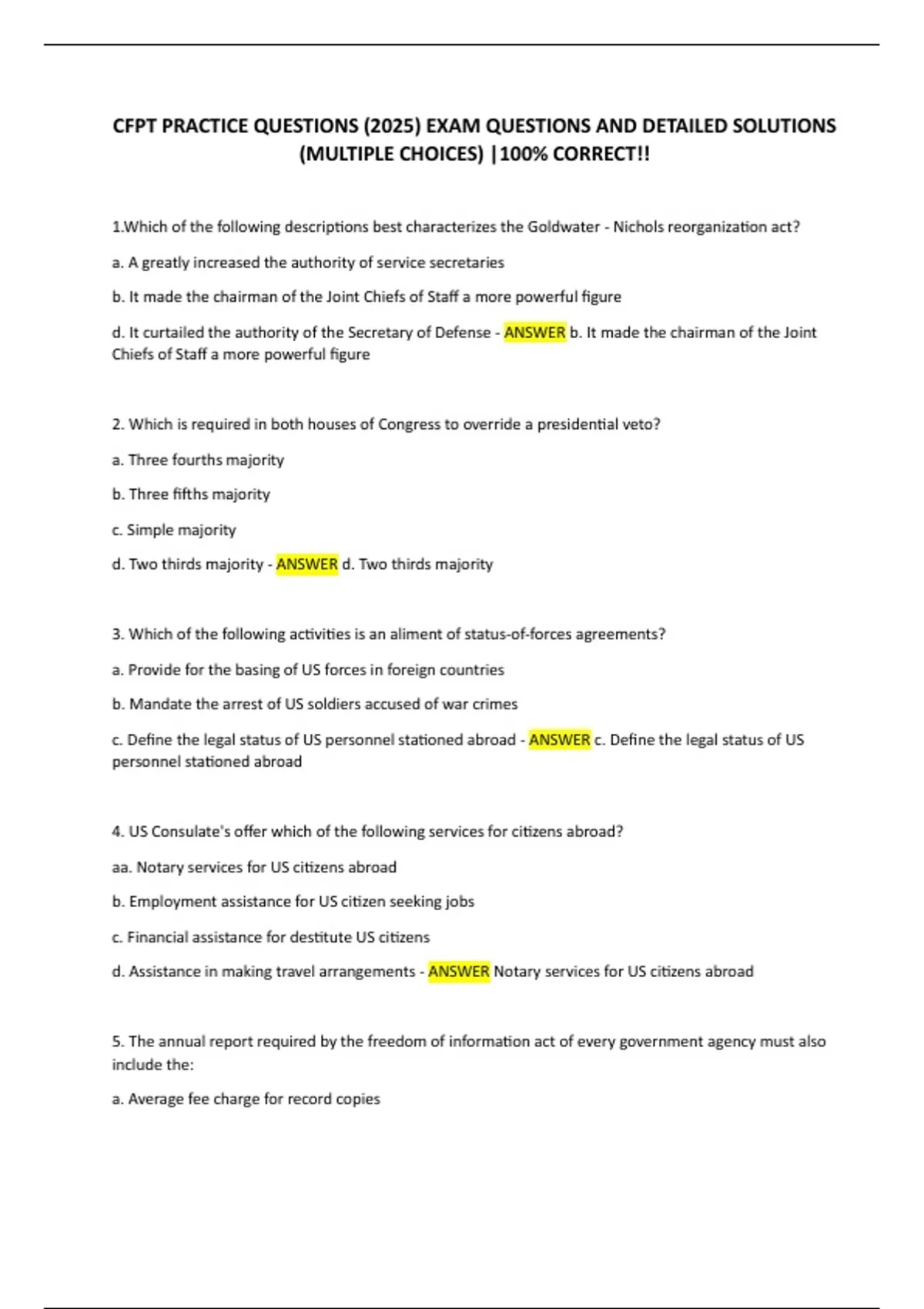 1.Which of the following descriptions best characterizes the Goldwater - Nichols reorganization act? a. A greatly increased the authority of service secretaries b. It made the chairman of the Joint Chiefs of Staff a more powerful figure d. It curtailed the authority of the Secretary of Defense - ANSWER b. It made the chairman of the Joint Chiefs of Staff a more powerful figure 2. Which is required in both houses of Congress to override a presidential veto? a. Three fourths majority b. Three fifths majority c. Simple majority d. Two thirds majority - ANSWER d. Two thirds majority 3. Which of the following activities is an aliment of status-of-forces agreements? a. Provide for the basing of US forces in foreign countries b. Mandate the arrest of US soldiers accused of war crimes c. Define the legal status of US personnel stationed abroad - ANSWER c. Define the legal status of US personnel stationed abroad 4. US Consulate's offer which of the following services for citizens abroad? aa. Notary services for US citizens abroad b. Employment assistance for US citizen seeking jobs c. Financial assistance for destitute US citizens d. Assistance in making travel arrangements - ANSWER Notary services for US citizens abroad 5. The annual report required by the freedom of information act of every government agency must also include the: a. Average fee charge for record copies b. Average number of days taken to respond to request c. Names and dates of all requests d. Identities of all those making requests - ANSWER b. Average number of days taken to respond to request 6. If you're not satisfied with the initial response to your freedom of information act request, you: a.May petition at the Atty. Gen. directly b.. May file an administrative appeal c, Have no choice but to accept the result d. File an appeal But you may be charged - ANSWER May file an administrative appeal 7. Fee waivers for freedom of information act request can be made if the requester can: a. Demonstrate that the fee is unaffordable b. Prove that the disclosure is in the public interest c. Prove that the government made an error in the case being discussed d. Demonstrate that he or she is unemployed - ANSWER b. Prove that the disclosure is in the public interest 8. Under the freedom of information act, US government agencies have how many business days to respond to requests? a. 5 b. 10 c. 15 d. 20 - ANSWER d. 20 9. Which of the following promised US assistance to "free people resisting orange minorities or outside pressures"? a. Marshall plan b. Warsaw Pact c. Truman doctrine d. Paris declaration - ANSWER c. Truman doctrine 10. Which agency is exempt from the freedom of information act? a. The CIA b. The national security agency c. the national Security Council d. The Defense intelligence agency - ANSWER b. The national security agency