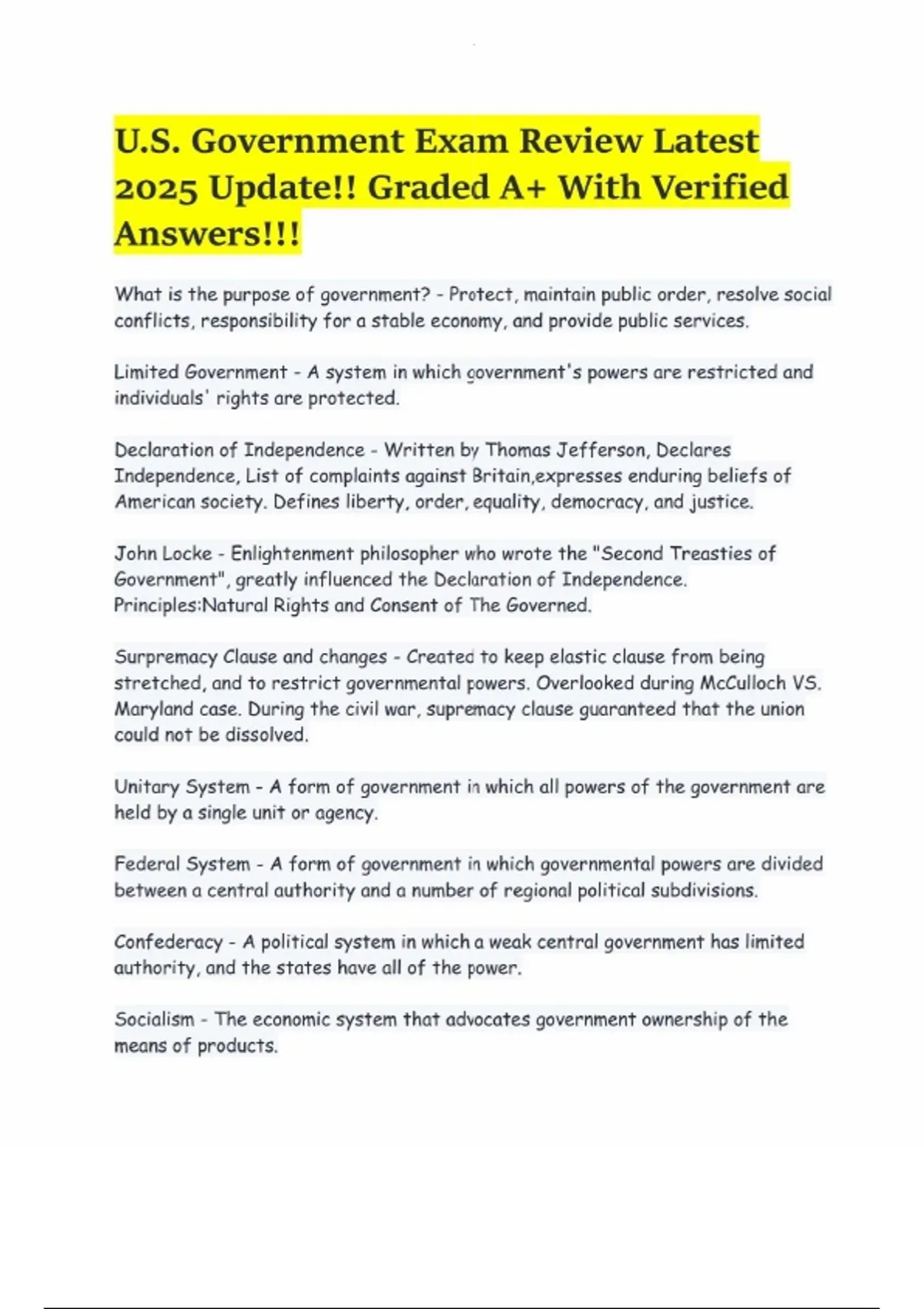 U.S. Government Exam Review 2025: Graded A+ With Verified Answers & Complete Study Guide