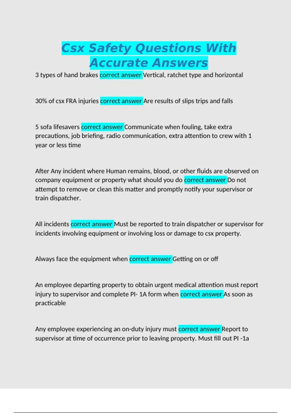 3 types of hand brakes correct answer Vertical, ratchet type and horizontal 30% of csx FRA injuries correct answer Are results of slips trips and falls 5 sofa lifesavers correct answer Communicate when fouling, take extra precautions, job briefing, radio communication, extra attention to crew with 1 year or less time After Any incident where Human remains, blood, or other fluids are observed on company equipment or property what should you do correct answer Do not attempt to remove or clean this matter and promptly notify your supervisor or train dispatcher. All incidents correct answer Must be reported to train dispatcher or supervisor for incidents involving equipment or involving loss or damage to csx property. Always face the equipment when correct answer Getting on or off An employee departing property to obtain urgent medical attention must report injury to supervisor and complete PI- 1A form when correct answer As soon as practicable Any employee experiencing an on-duty injury must correct answer Report to supervisor at time of occurrence prior to leaving property. Must fill out PI -1a