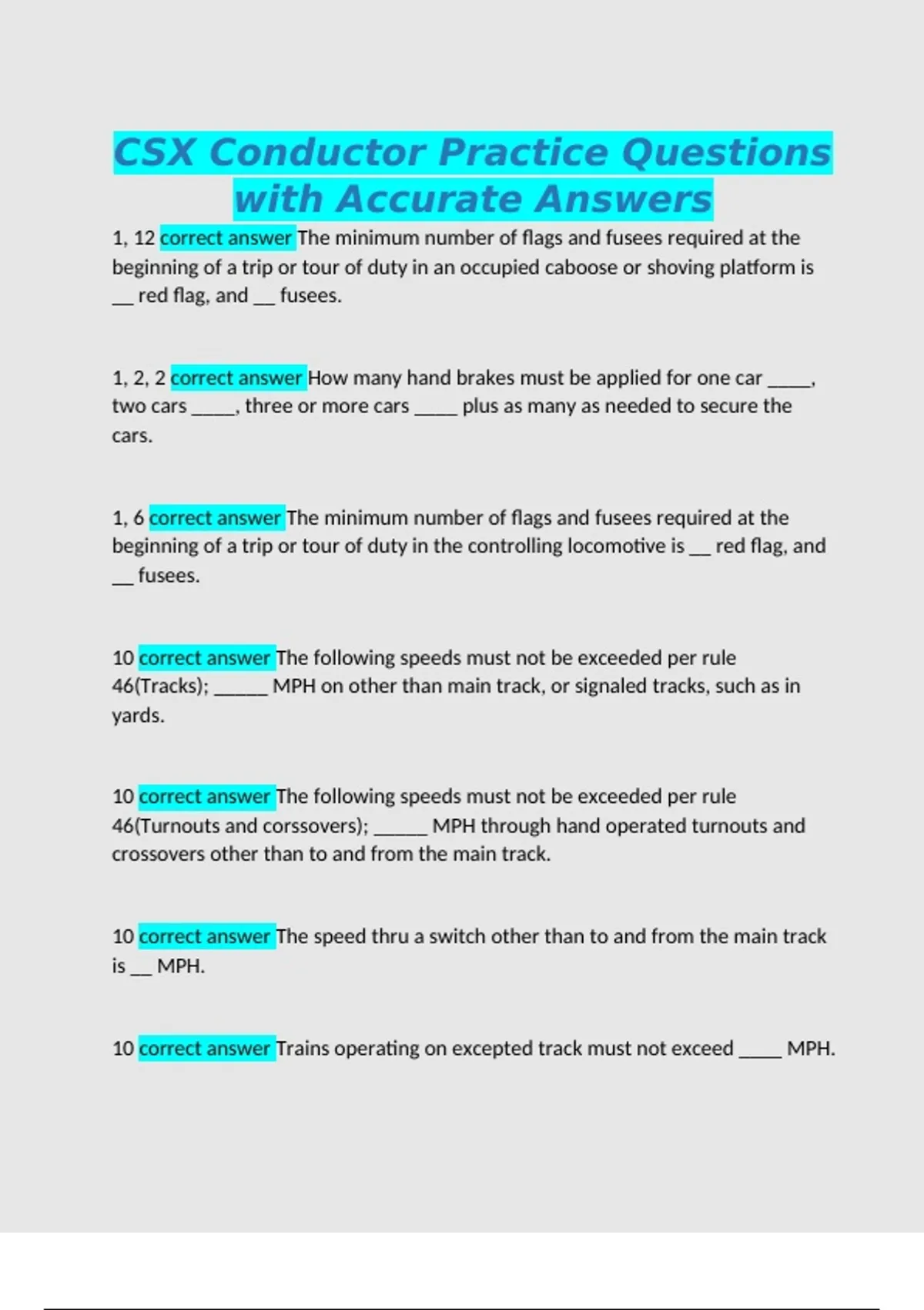10 correct answer Trains operating on excepted track must not exceed ____ MPH.