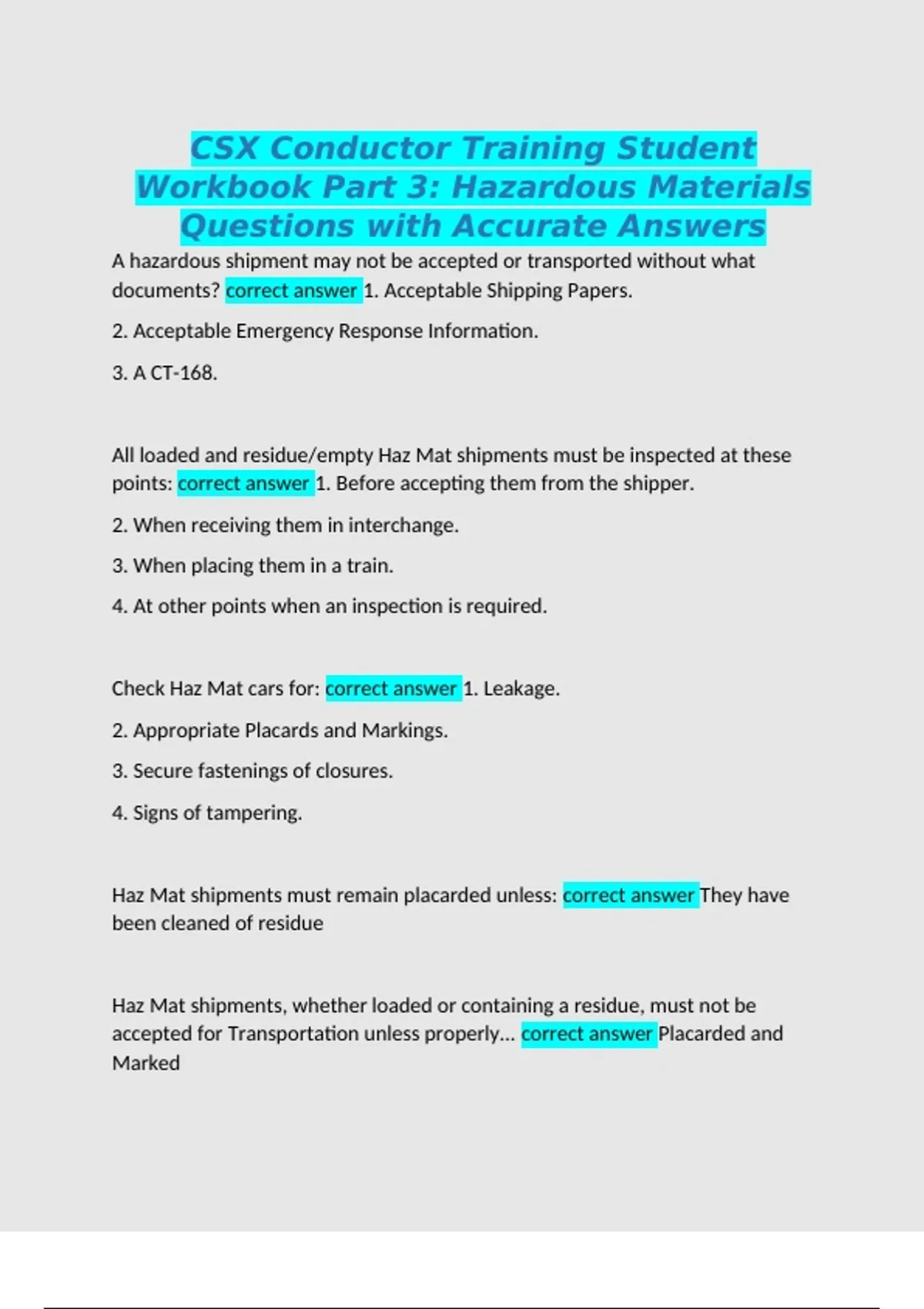 CSX Conductor Training Student Workbook Part 3: Hazardous Materials Questions with Accurate Answers