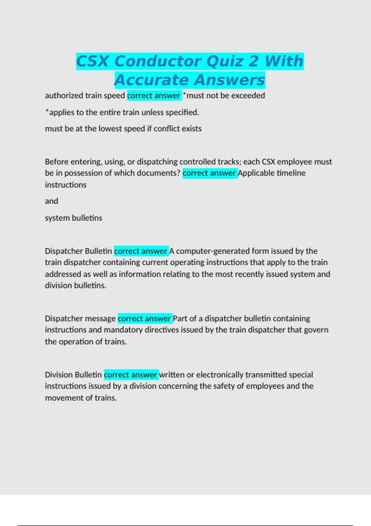 authorized train speed correct answer *must not be exceeded *applies to the entire train unless specified. must be at the lowest speed if conflict exists Before entering, using, or dispatching controlled tracks; each CSX employee must be in possession of which documents? correct answer Applicable timeline instructions and system bulletins Dispatcher Bulletin correct answer A computer-generated form issued by the train dispatcher containing current operating instructions that apply to the train addressed as well as information relating to the most recently issued system and division bulletins. Dispatcher message correct answer Part of a dispatcher bulletin containing instructions and mandatory directives issued by the train dispatcher that govern the operation of trains. Division Bulletin correct answer written or electronically transmitted special instructions issued by a division concerning the safety of employees and the movement of trains. Division notice correct answer Written or electronically transmitted notice issued by a division containing information and instructions not affecting the movement of trains