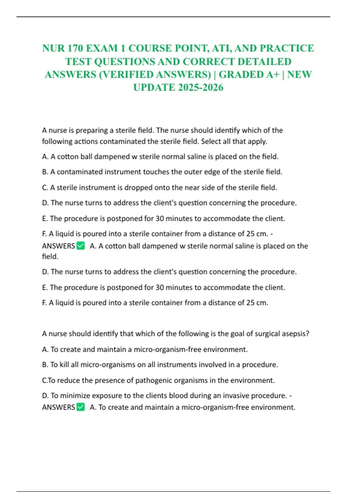 NUR 170 EXAM 1 COURSE POINT, ATI, AND PRACTICE