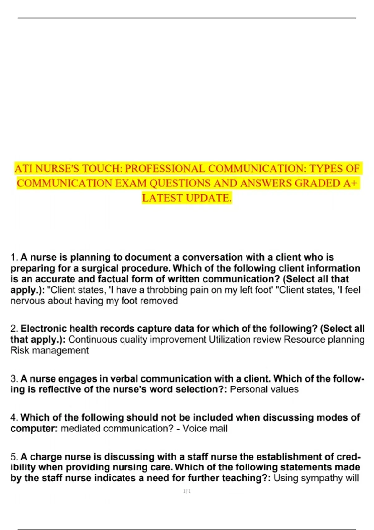 ATI NURSE'S TOUCH: PROFESSIONAL COMMUNICATION: TYPES OF COMMUNICATION EXAM QUESTIONS AND ANSWERS GRADED A+ LATEST UPDATE. ATI Nurse's Touch communication professional communication exam types of communication questions nursing communication exam ATI communication practice questions Nurse's Touch exam answers latest ATI exam update communication skills for nurses ATI communication test nursing exam communication questions nurse professional communication ATI Nurse's Touch study guide communication test for nurses ATI communication questions and answers Nurse's Touch study material ATI exam graded A+ latest ATI communication practice ATI exam preparation for nurses types of professional communication ATI Nurse's Touch updates communication exam for nurses ATI exam review communication nurse communication skills test ATI Nurse's Touch communication questions nursing communication techniques