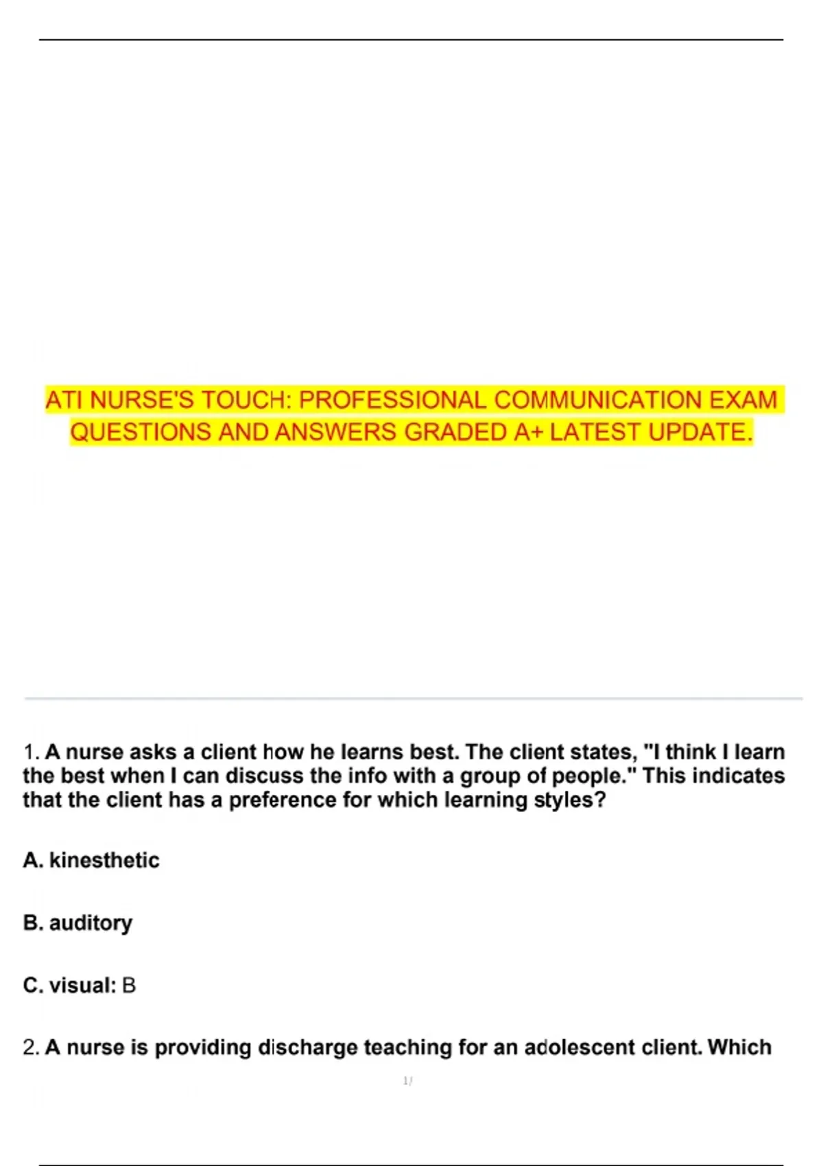 ATI NURSE'S TOUCH: PROFESSIONAL COMMUNICATION EXAM QUESTIONS AND ANSWERS GRADED A+ LATEST UPDATE. ATI Nurse's Touch exam professional communication exam questions nurse's touch questions and answers ATI communication test nurse communication graded A+ latest ATI exam update nursing exam questions and answers professional ATI exam prep ATI communication study guide nurse's touch practice test ATI exam questions 2025 nursing communication exam ATI professional communication answers nurse's touch exam preparation ATI exam practice questions nursing communication test latest ATI graded A+ questions nurse's touch communication answers ATI exam study materials professional communication in nursing ATI nurse communication exam nursing professional exam latest ATI nurse's communication prep ATI professional test latest update nurse's touch review questions ATI exam test bank professional communication ATI test nursing communication exam update ATI test preparation guide ATI nurse's touch course materials