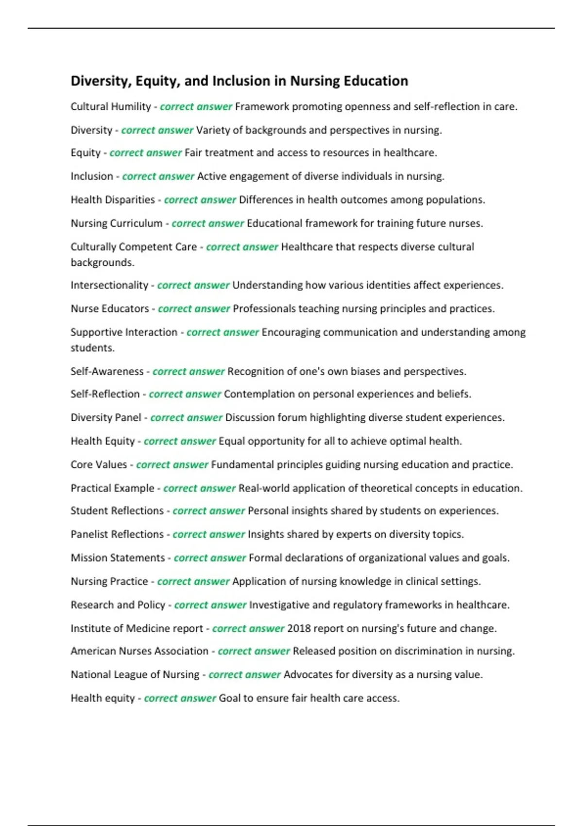 Cultural Humility - correct answer Framework promoting openness and self-reflection in care. Diversity - correct answer Variety of backgrounds and perspectives in nursing. Equity - correct answer Fair treatment and access to resources in healthcare. Inclusion - correct answer Active engagement of diverse individuals in nursing. Health Disparities - correct answer Differences in health outcomes among populations. Nursing Curriculum - correct answer Educational framework for training future nurses. Culturally Competent Care - correct answer Healthcare that respects diverse cultural backgrounds. Intersectionality - correct answer Understanding how various identities affect experiences.