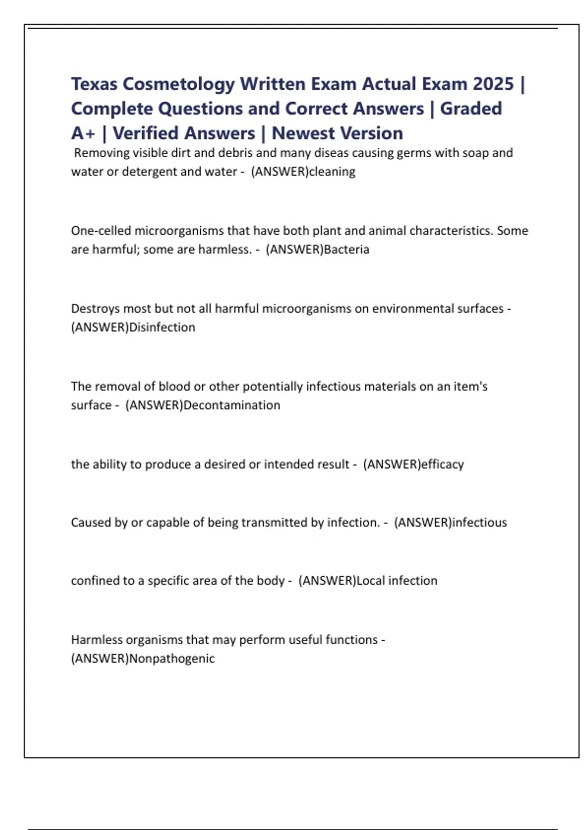 Texas Cosmetology Written Exam Actual Exam 2025 | Complete Questions and Correct Answers | Graded A+ | Verified Answers | Newest Version